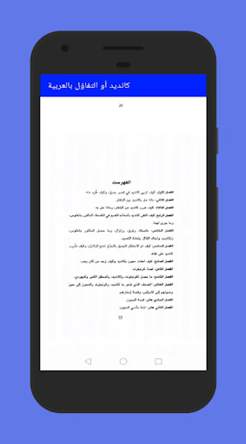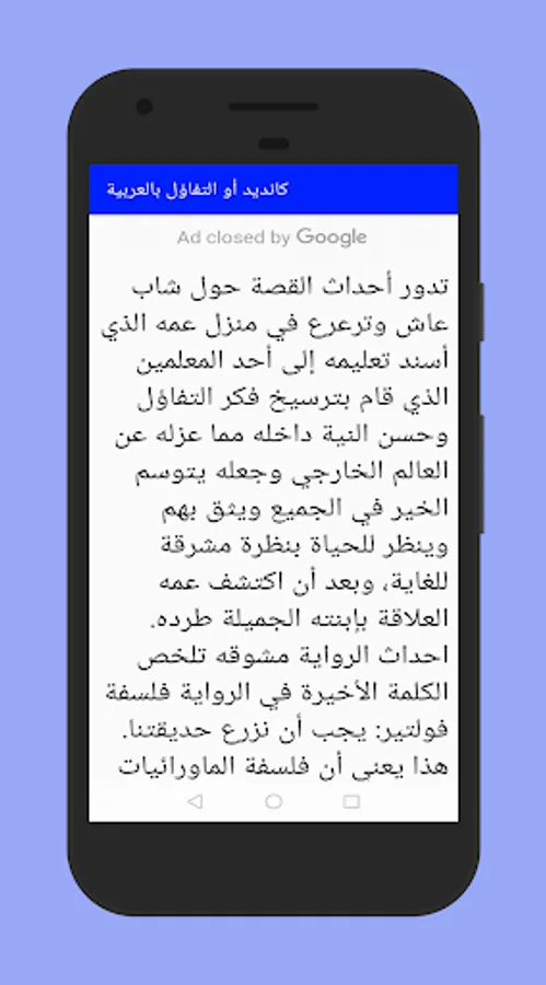 The story revolves around an innocent young man who lived and grew up in the palace of his uncle who assigned his education to one of the teachers who instilled the thought of optimism and goodwill inside him, which isolated him from the outside world and made him mediate the good in everyone and trusts them and looks at life with a very bright look, and after his uncle discovered the relationship with his beautiful daughter Drive him out. The events of the novel interesting, summarizing the last word in the novel The philosophy of Voltaire: "We must plant our garden." This means that metaphysics philosophy is incapable of solving the issues a person raises about his existence, and that by work alone a person can find happiness.