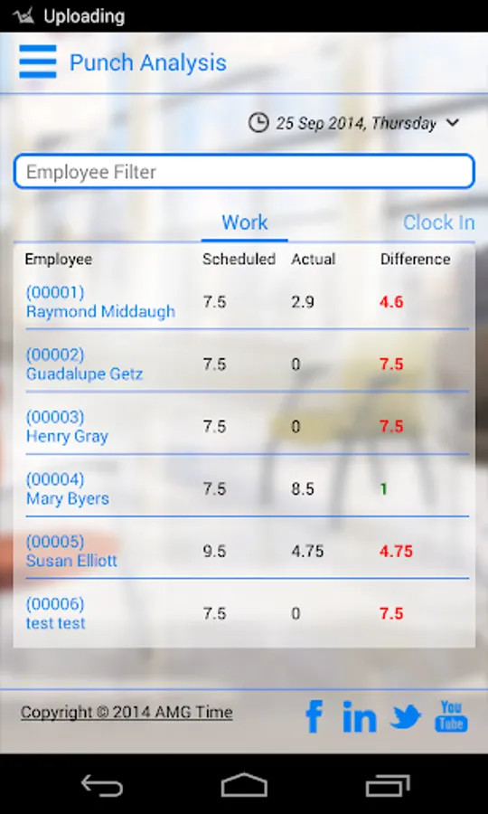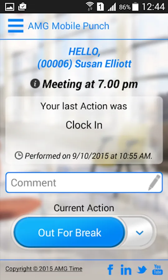 The AMGtime mobile application is a component of AMG Attendance System online solution. The application allows employees to punch in and out remotely from pre-assigned locations using their mobile phones. Mobile punches are being transferred to the system in a real-time mode. Using this application, employees can also perform department and job transfers, as well as see messages assigned by the system administrator.