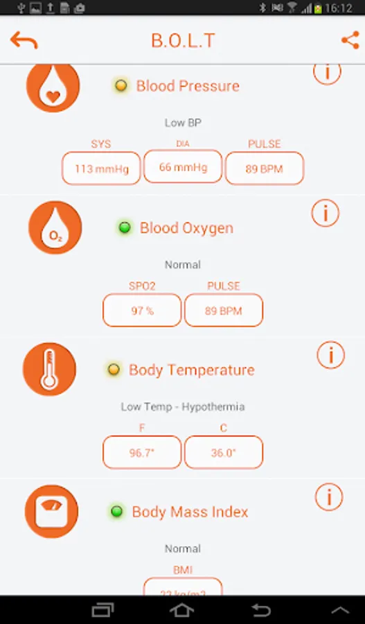 The BOLT app with the BOLT device (Please place an order for BOLT device from www.amzbolt.com) allows you to measure and keep track of the following vitals