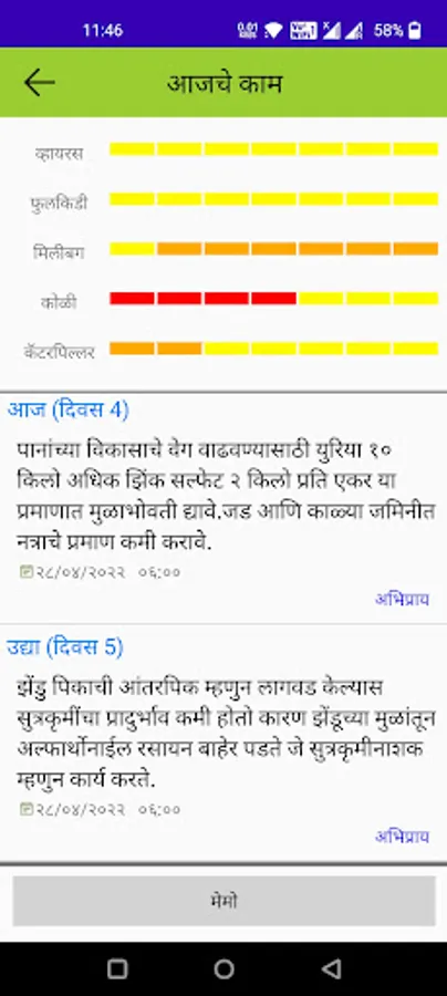 Crop advisory : Contains advisory information based individual member’s area climate, crop, age of crop, topography and geology, irrigation facilities available and adopted, soil type, disease control and curative methods and practices pertaining to the above so as to avoid repetitive occurances based on microbial life patterns and adaptation siginificant in the vicinity.