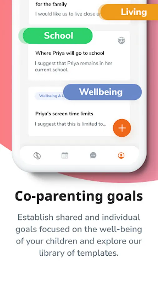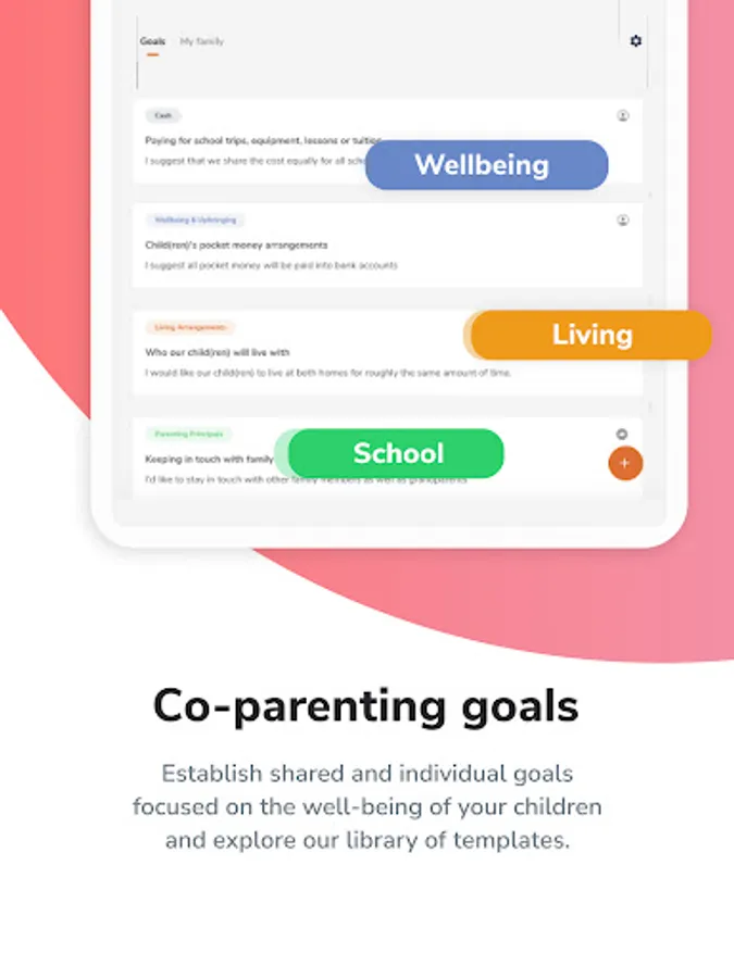 Set private goals and shared the goal with your ex-partner to keep you both focussed on the future and able to manage each other’s co-parenting expectations. Use the pre-filled suggestions on the most common parenting topics or create your own bespoke goals unique to your family set-up.