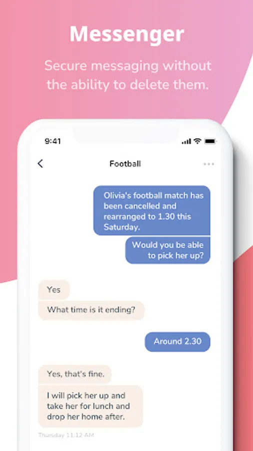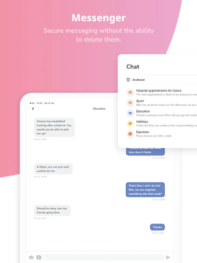 Secure inbuilt messaging function to communicate with your co-parent on all aspects of parenting. Includes pre-defined chat topics as helpful prompts from other co-parents or create your own. Keep track of the conversations with your ex-partner. Unlike most messaging tools, messages are time stamped and can’t be deleted.