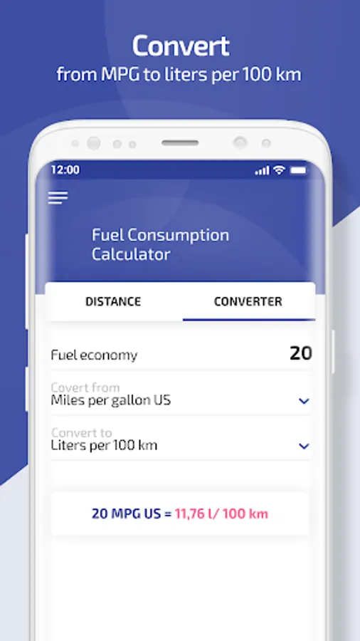 This app has very simple converter average fuel consumption. It supports: MPG (US and UK), KM/L, L/100KM.
