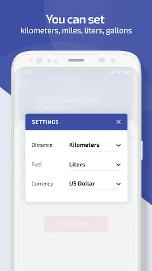 The application works with different units: kilometers, miles, liters, gallons (US and UK).