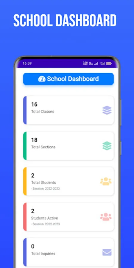 Amiga e-School staff app is connected to School Management System at www.amigaeschool.com, through which school Admins/staff can Login to School Management System and can manage following Dashboards:-
