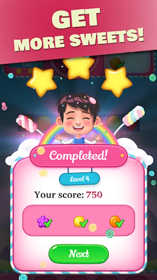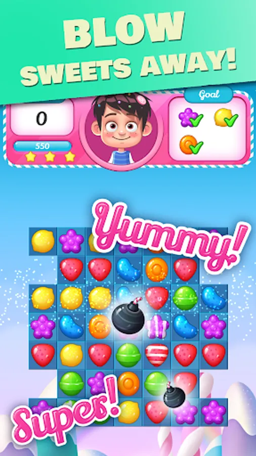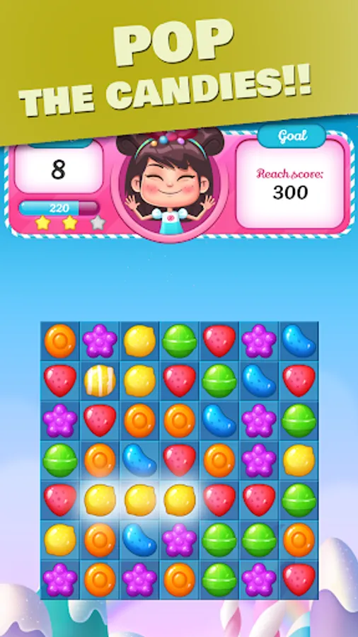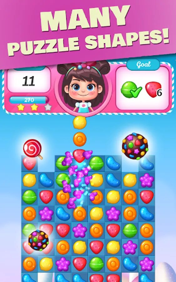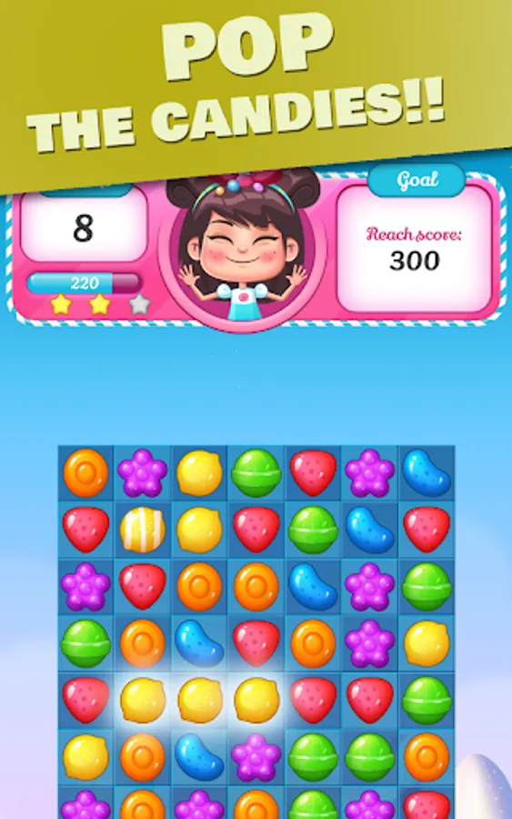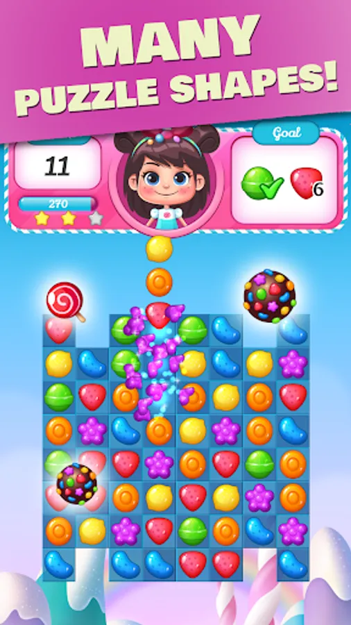 Connect 3 or more candies in the same color and release your finger, sweet candies will blast!