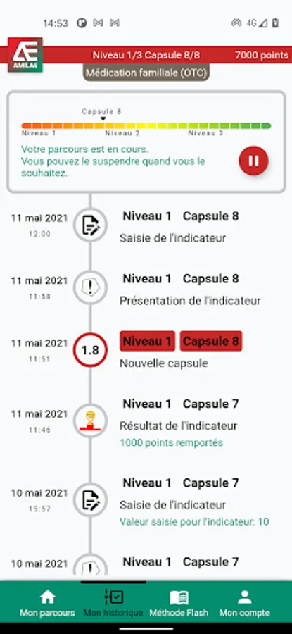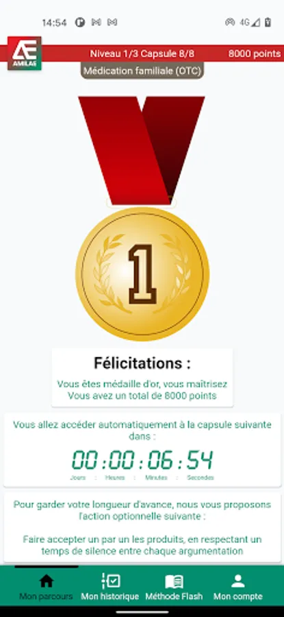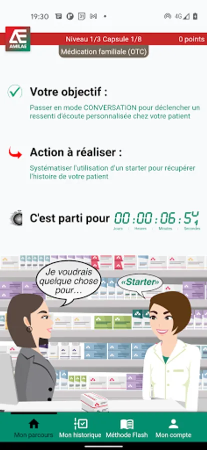 The Amilae application is intended for owners and pharmacy dispensing teams. It represents the application part of a global support program for the development of advice and for the optimization of the Pharmaceutical Act. The program includes an initial part of learning the Amilae Counseling Method, specific to the dispensary: online learning on the site https://www.anim-act.com. Following connected learning, the Amilae application offers the user a step-by-step assimilation path, in connection with their daily exercise. The course begins with a quiz to validate what has been learned, then guides the user through a journey made up of 24 learning capsules, sequenced in 3 levels: Initiate, Confirmed, Expert. Each capsule results in the acquisition of points.