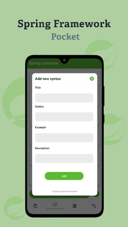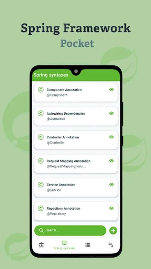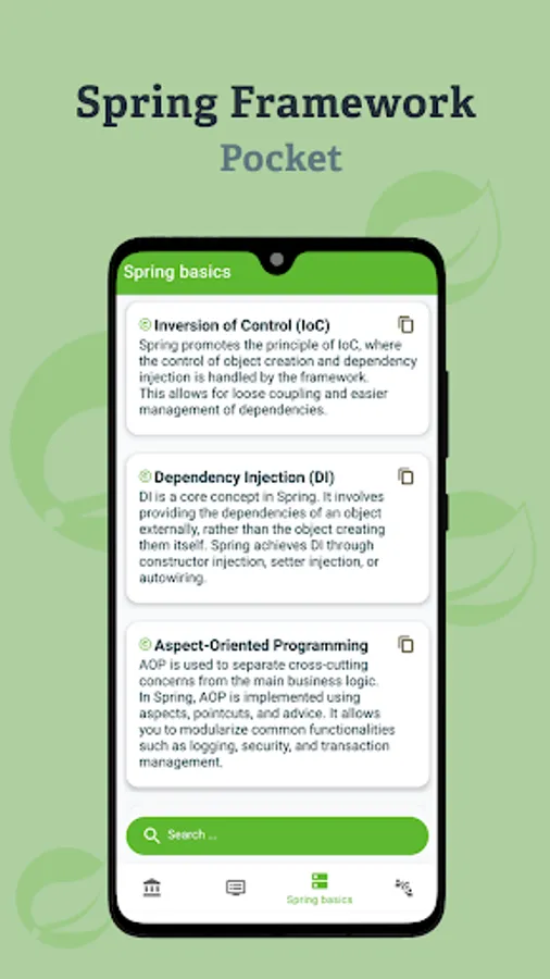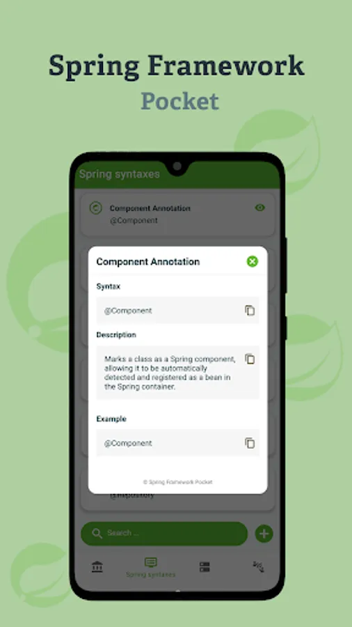 Spring Framework Pocket is a user-friendly mobile application designed to serve as a convenient and concise reference guide for developers working with the Spring Framework.