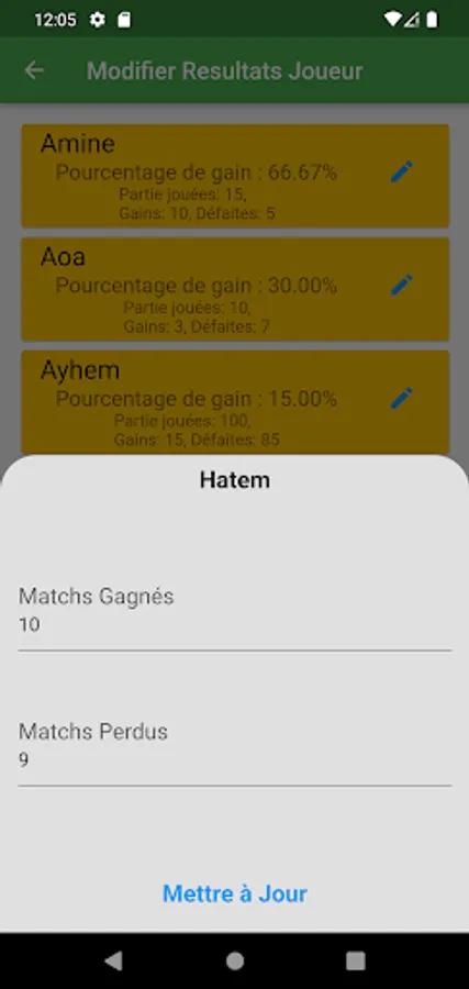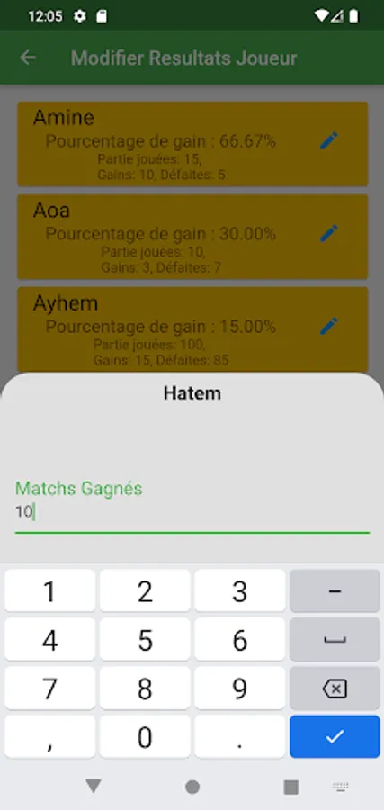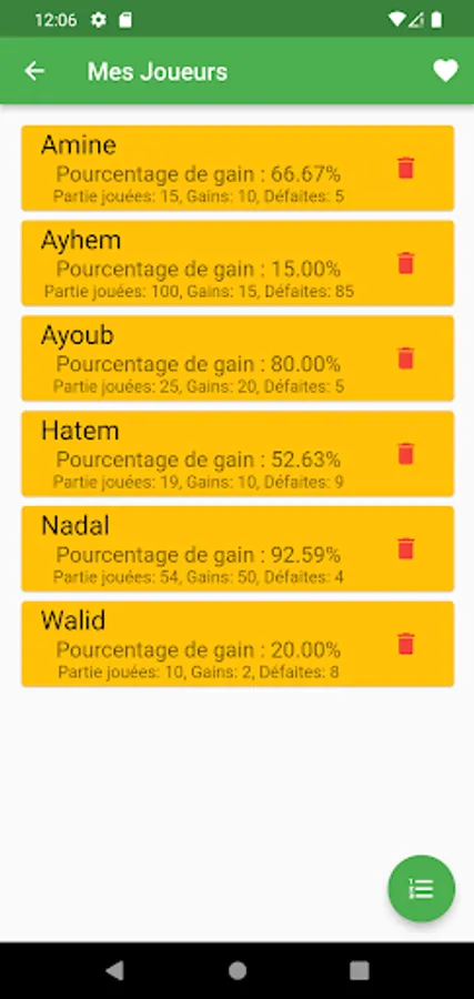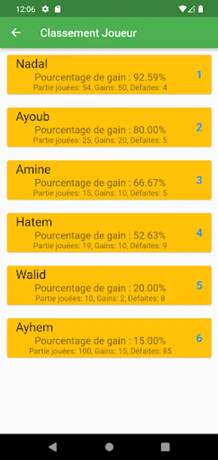 3. Player View: Browse a full list of all players you have saved in the app. Get a quick overview of each player's essential stats, such as win percentage, total number of games played, number of wins and losses, and more.