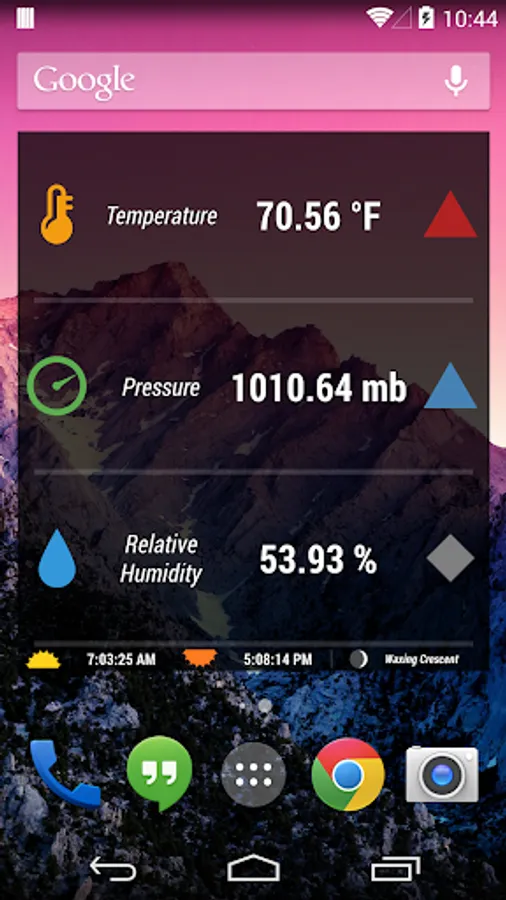 Most Android devices still do not have a barometer, ambient thermometer, or hygrometer. See the (probably incomplete) COMPATIBILITY list below for devices that this app is useful with.