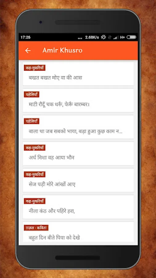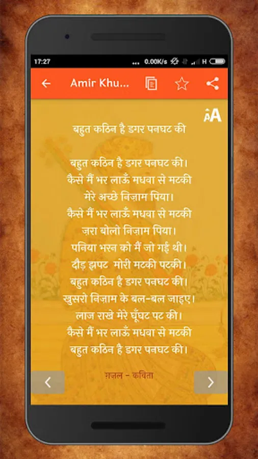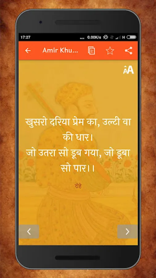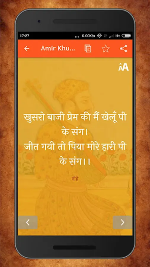 Abul Hasan Yamin-ud-Din Khusro (1253-1325) popularily known as Amir Khusro was an Indian musician, scholar and poet. He was a Sufi mystic and a spiritual disciple of Nizamuddin Auliya of Delhi. He wrote poetry in Persian and Hindavi. He is regarded as the ‘father of qawwali’. He enriched Hindustani classical music by introducing Persian and Arabic elements in it. He was the originator of the khayal and tarana styles of music. He also invented tabla. His verse forms include Ghazal, Masnavi, Qata, Rubai, Do-Beti and Tarkibhand. His main poetical works are Tuhfa-tus-Sighr, Wastul-Hayat, Ghurratul-Kamaal,Nihayatul-Kamaal, Mathnavi Noh Sepeh etc. Khusro's Hindavi Poetry {pahelis (riddles), dohas (couplets) and geets (songs)} seem to have been orally transferred from generation to generation by Qawwals, mirasees (professional singers), bhands (stage performers) and women-folk.