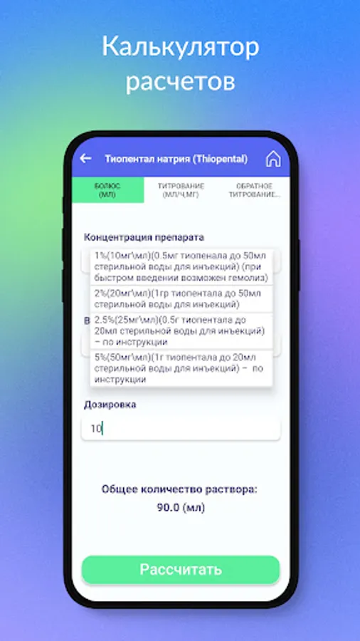 Ability to calculate bolus, administration, titration rate of drugs in ml, ml / h and in mg, mg / kg