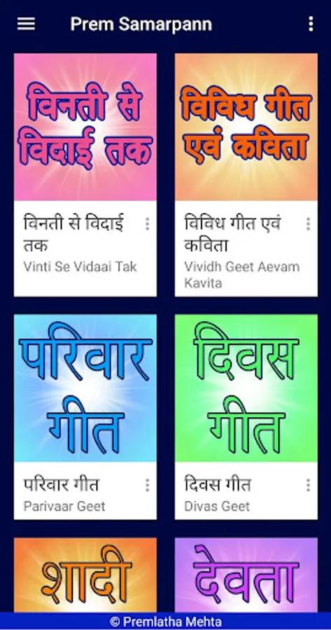 Prem Samarpann is an App designed for the music lovers to sing. All songs of this App are self written by Premlatha Mehta from Perambur, Chennai. The collections are wide, most of the songs are religious that are useful for most of the cultural and religious events of society and some are songs sung in marriages. The songs are based on bollywood tunes. The App is a true dedication for all music lovers. New songs will be updated from time to time.