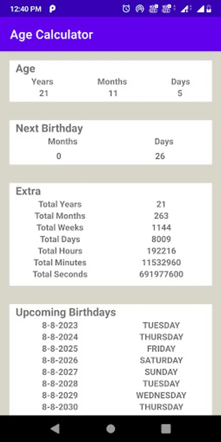 This easy calculator app also enables you to share your exact age, upcoming birthday and time you have lived for, to your friends, families, colleagues through any social media channel.