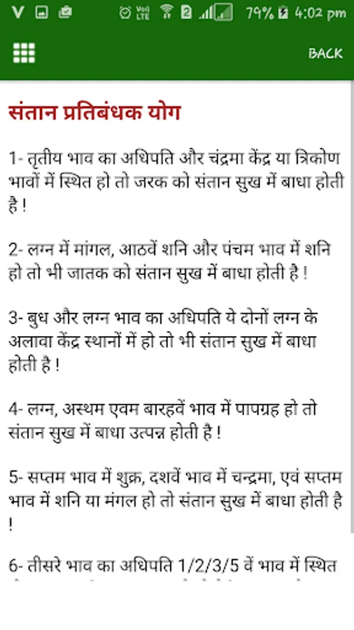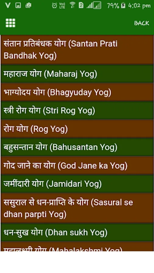 You can come to know about various types of Yog and the language used is Hindi. People speaking Hindi can easily follow what is written in this application. This application contains a database of various types of yog like dhan yog, sharir ke yog, svasthya ke yog and a lot others. You will find useful information related to kundli yogs of more than 400 yogs.