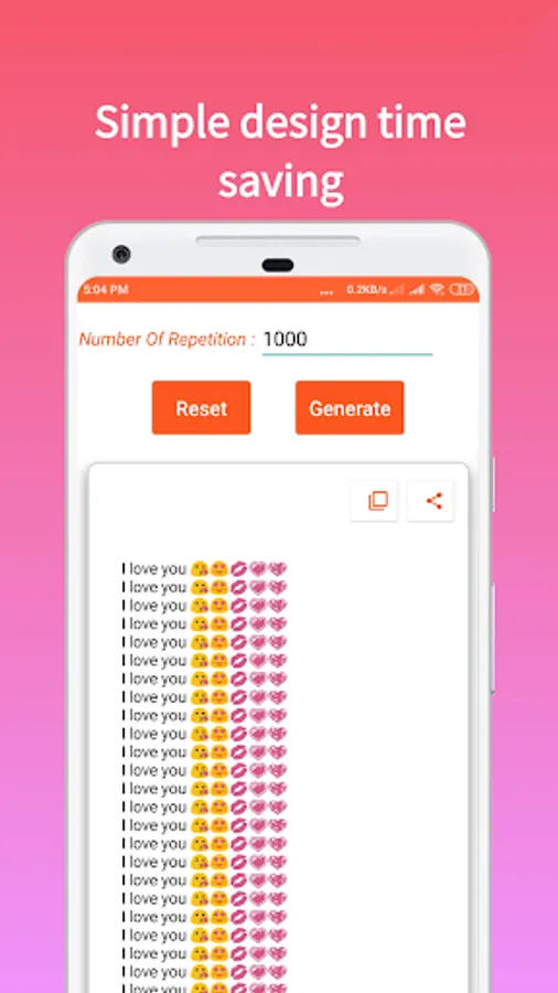 Withย ย using our application you can getย ย the entered text repeated as much time as you want. This app has multiple features like Text repeater,Text to emoji converter,Emoticons,Etc.It is very easy to use and it requires very low space as compare to other apps.It is complete set of tool for text messaging or chatting on for What'sย ย app, for facebook, for instagram,etc.You can share easily generated text to social media platforms and impress your friends.Let us have some fun with your friends.