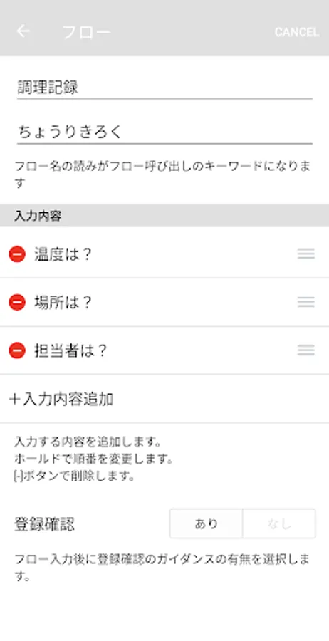 Recording is done by responding to the voice guidance instructions from the speaker. You can create multiple conversation flows according to the operation, such as "temperature", "good / bad", and "time".