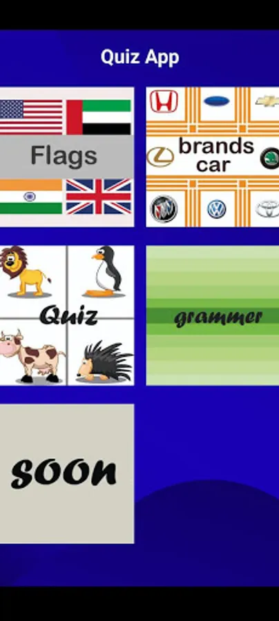 flag quiz , animal quiz , car brand quiz , English grammar quiz.