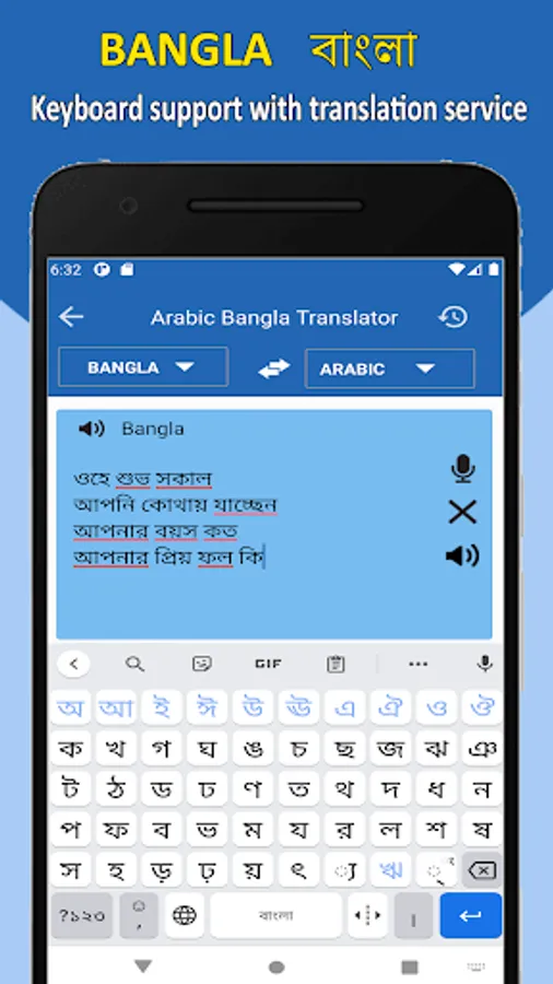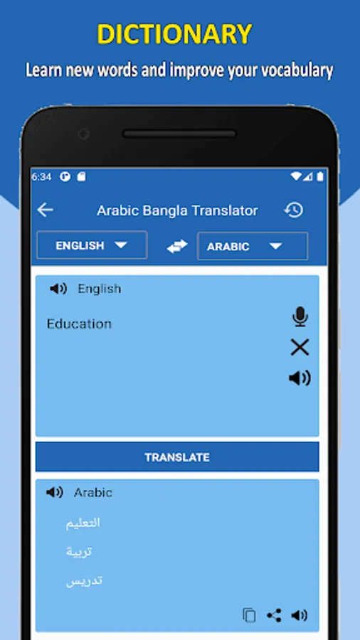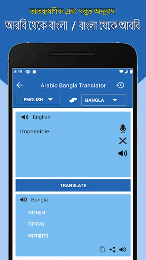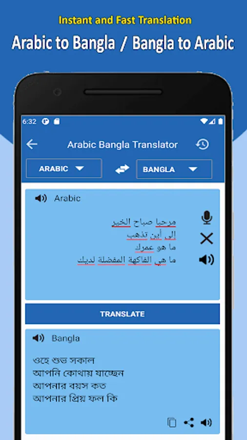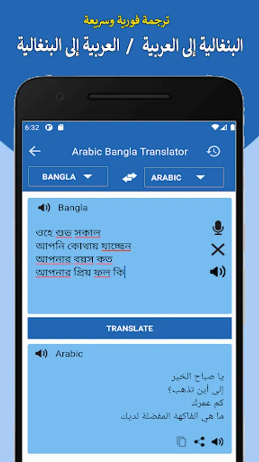 Arabic to Bangla Translator App will help you to translate word and text as well as Voice from Arabic to Bangla Language.