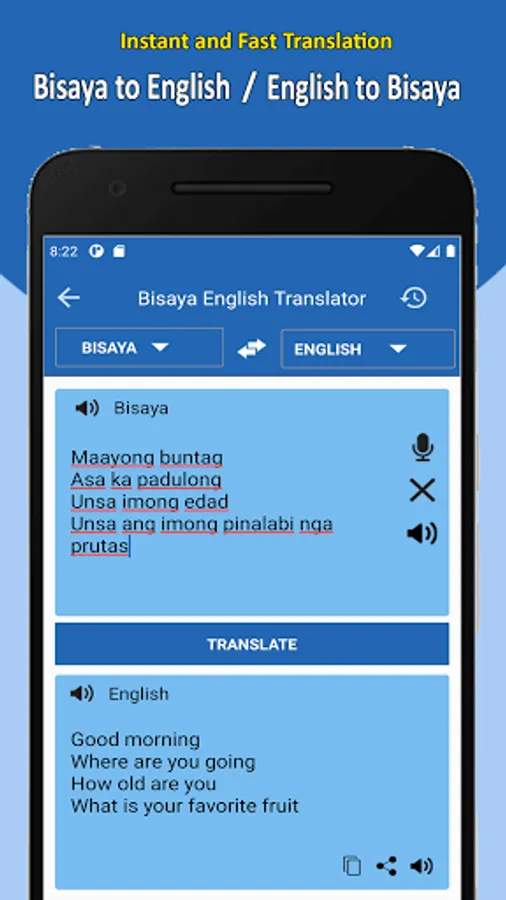 Bisaya English Translation is so cool for language conversion and translation. Bisaya Language Learning App is most advanced technology used in the translator app does the work accurately. Bisaya English Translation Application will help you to translate word and text as well as Voice from English to Bisaya Translation.