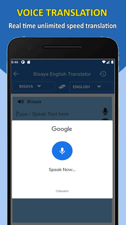 Text to speech feature - Bisaya Language translator has a unique speaking feature in it. user can use it by tapping text to speech feature on app and speak Bisaya word or sentences which user want to translate into English.