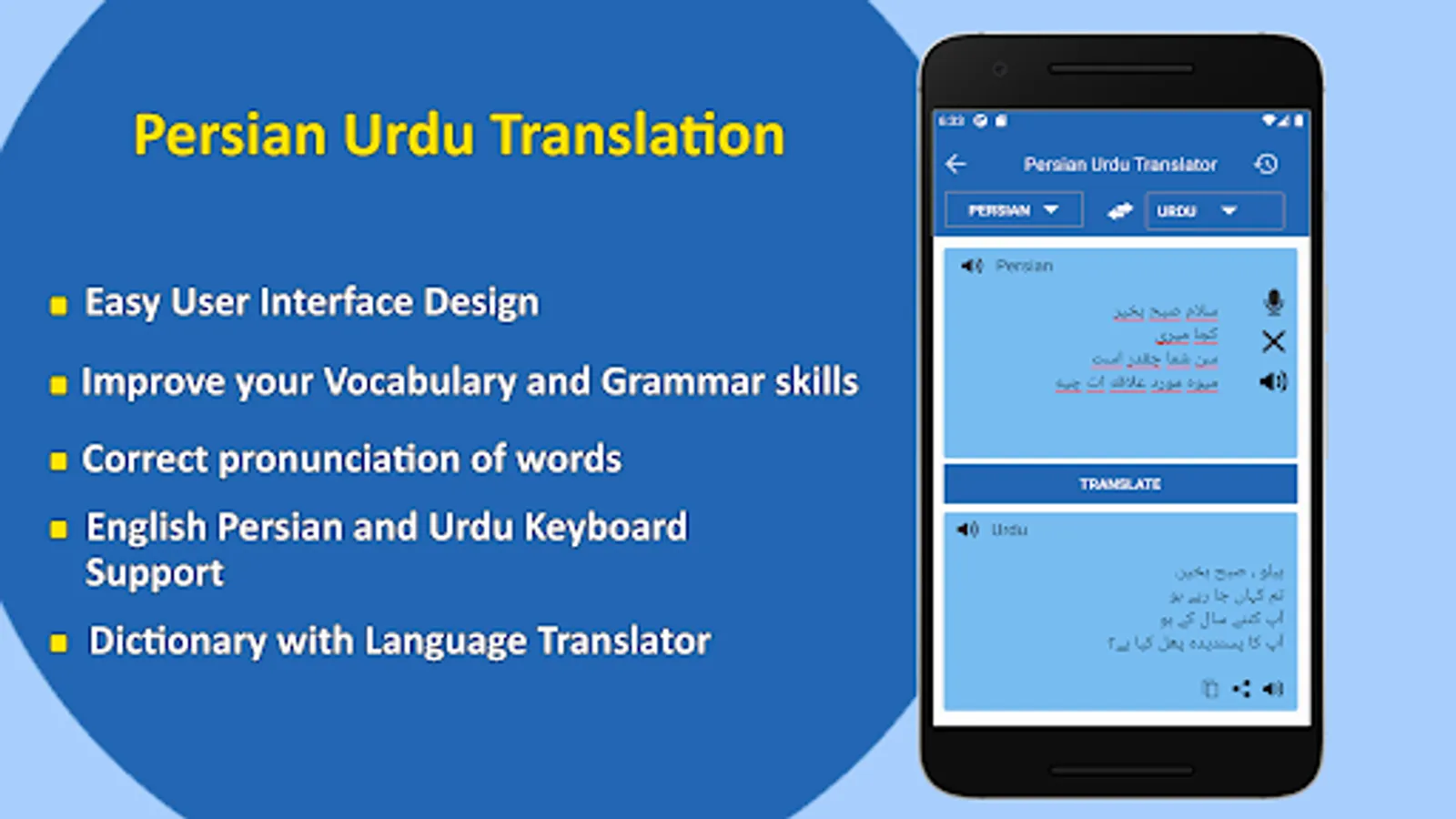 You Can learn Persian Phrases, improve vocabulary and pronunciation in a very effective way. You can memorize hundreds of Urdu To Persian words with translation which will help you to improve your Urdu To Persian vocabulary, so you can speak Persian Language fluently.