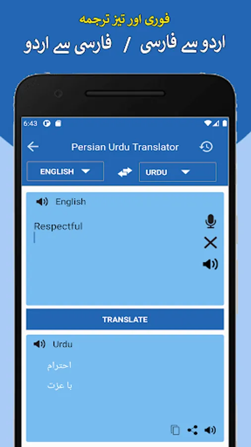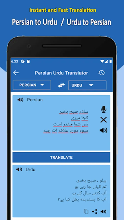 This fast Urdu To Persian Translation app is very easy and convenient to use for students, adults and for people who work in offices where they required to use Urdu To Persian language on daily basis.