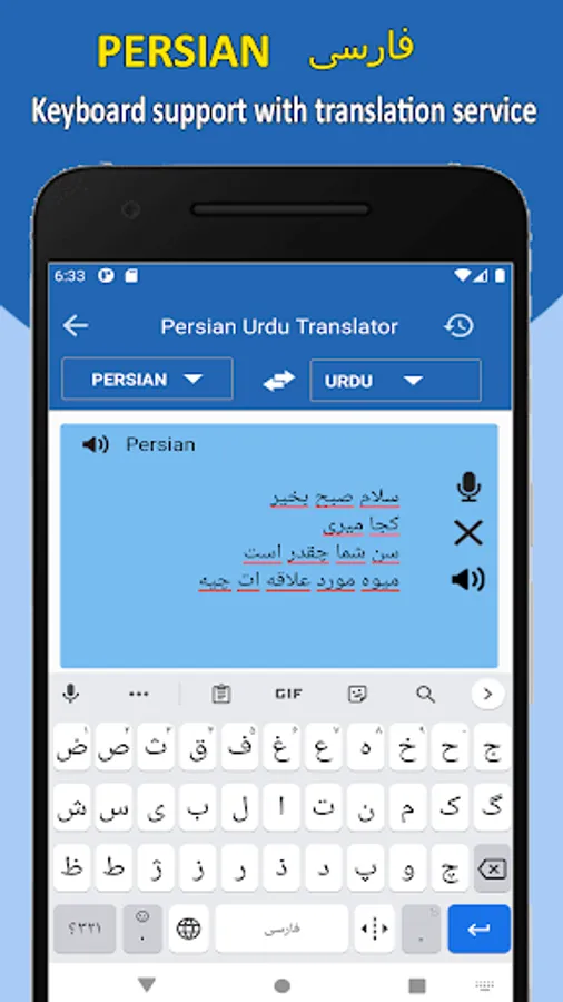 Persian to English translation Keyboard can also work as Persian to Urdu or English keyboard. For example if user want to write Persian word or sentences user do not need to change keyboard he just have to copy that words from translator app and paste into wherever he wants.