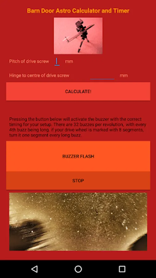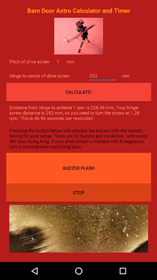 Want to build a barn door tracker? Don't worry about precision measurement and buying specific screws. Just build what you want, input the pitch of your drive screw the distance from the hinge to the screw, and you're all set! Star Tracker Calculator will tell you how fast to turn the drive screw and provide a helpful vibration and gentle screen flash to time it correctly, no matter what your setup.