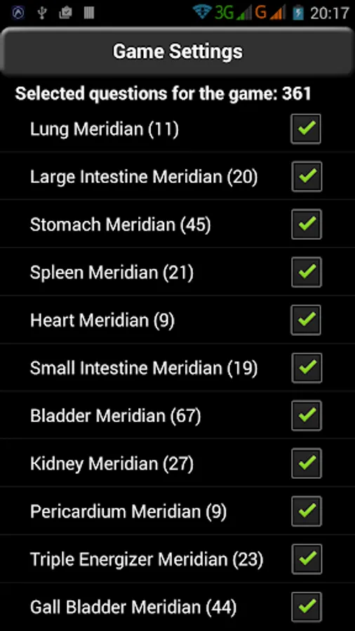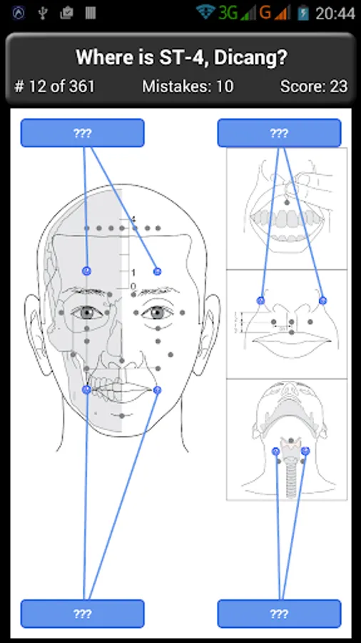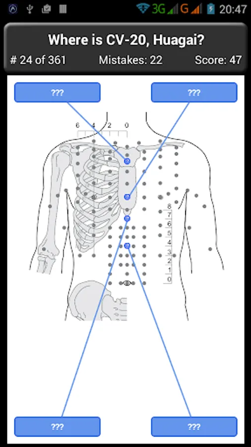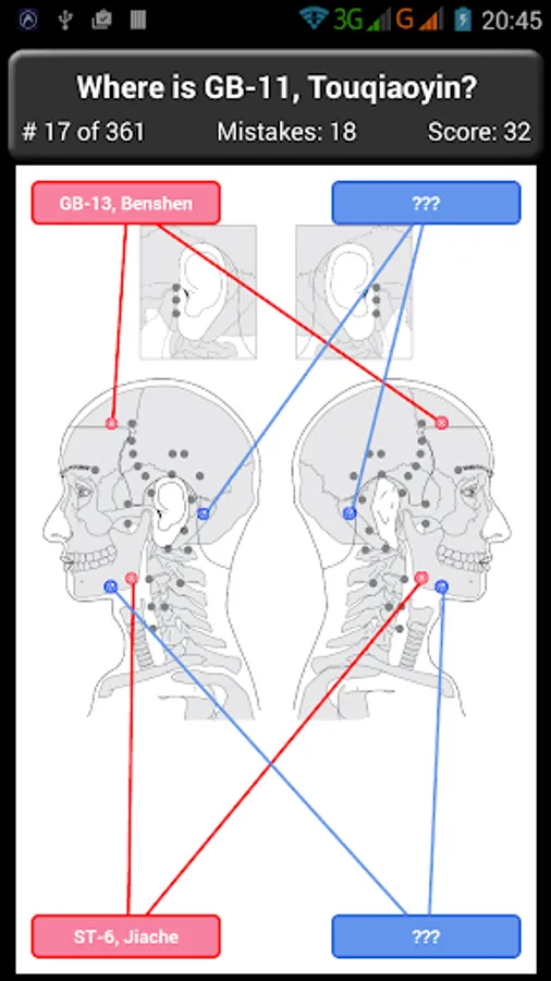 Each question has 4 possible answers. When you tap one of the answers, the default color of the pressed button/point is changed to green (when it was the right answer) or to red (wrong answer). You have 3 attempts to give the right answer. If you give it at the first attempt you will receive 3 points, at the second attempt - 2 points, at the third - 1 point. Play the "Acupuncture Points Body Quiz" now to test and improve your knowledge of the acupoints locations!