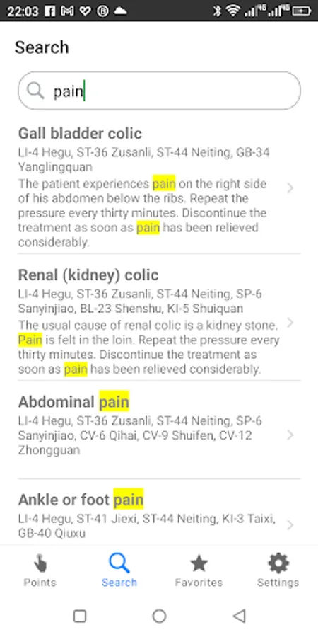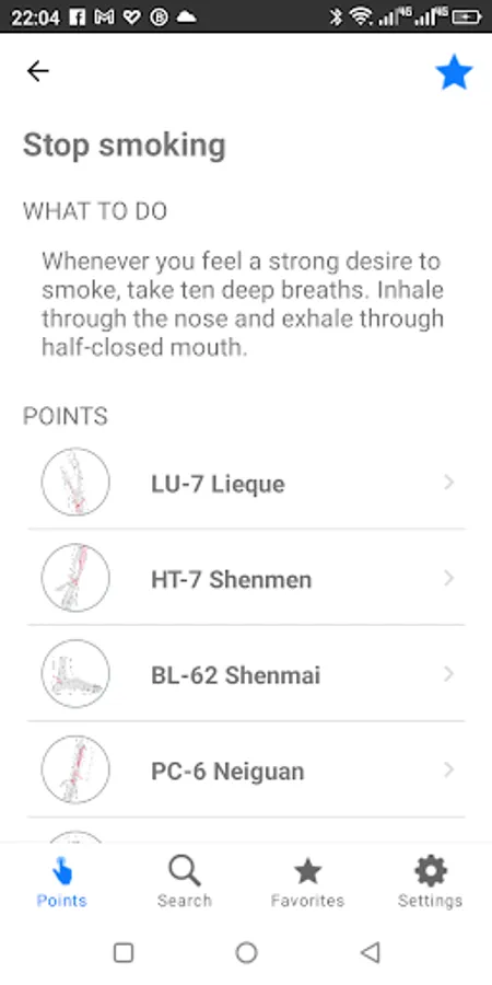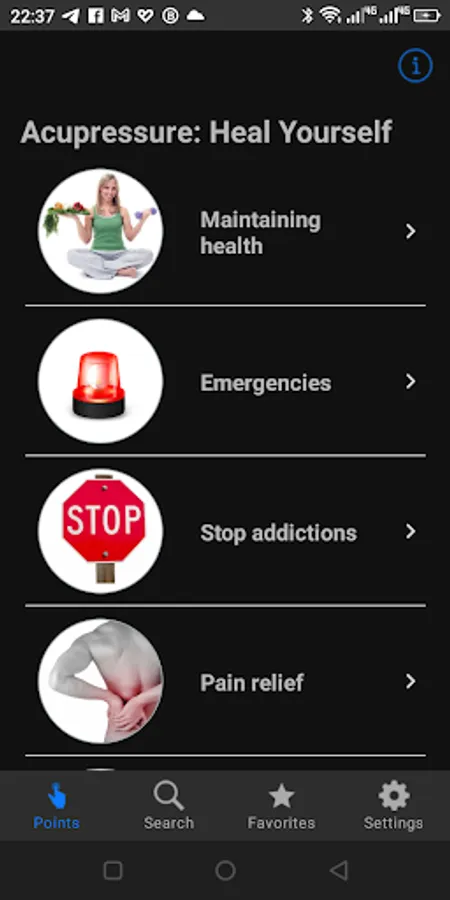 App contains over 90 points combinations to be used in different situations e.g. to relief the headache, to give up smoking, to reduce high blood pressure etc.