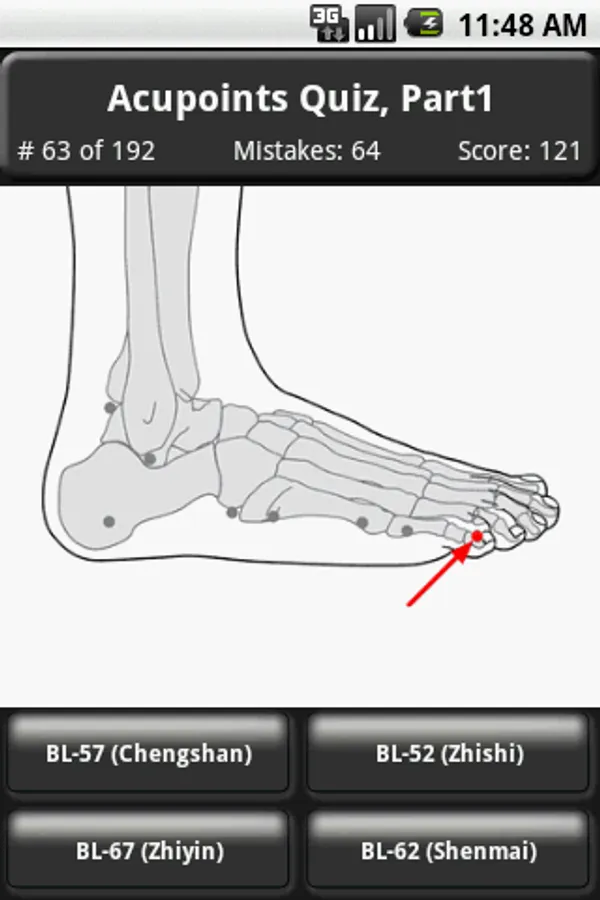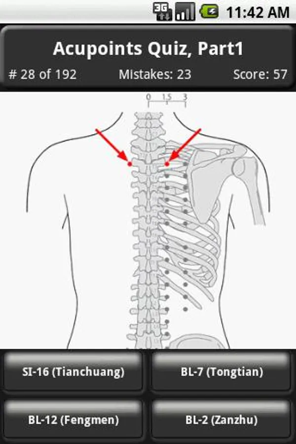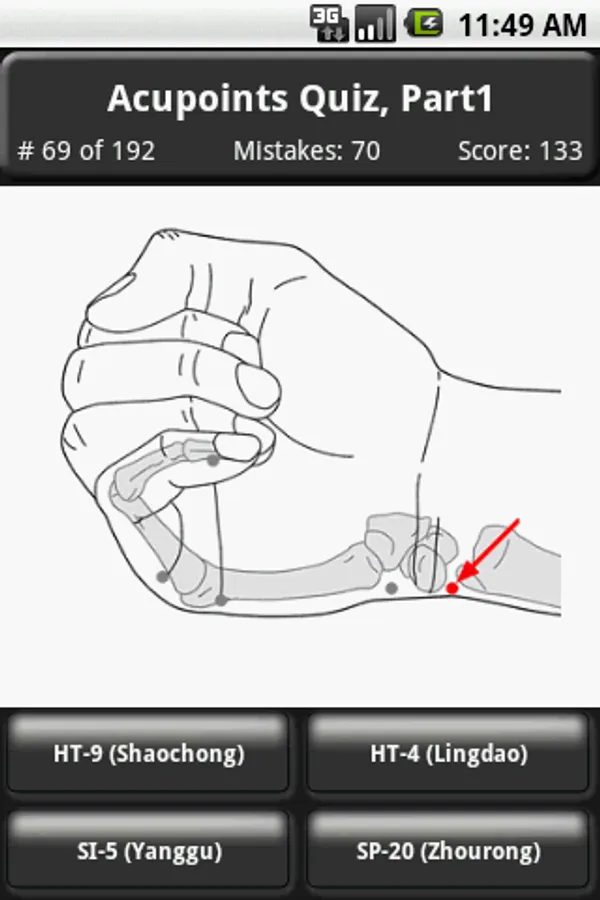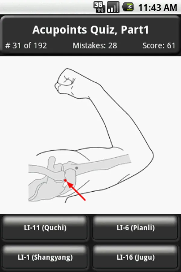 Each question has 4 possible answers. When you tap one of the answers, the default color of the pressed button is changed for a while to green (when it was the right answer) or to red (wrong answer). You have 3 attempts to give right answer. If you give it at the first attempt you will receive 3 points, at the second attempt - 2 points, at the third - 1 point. Play the "Acupoints Quiz, Part1" now to test and improve your knowledge of the acupuncture points!