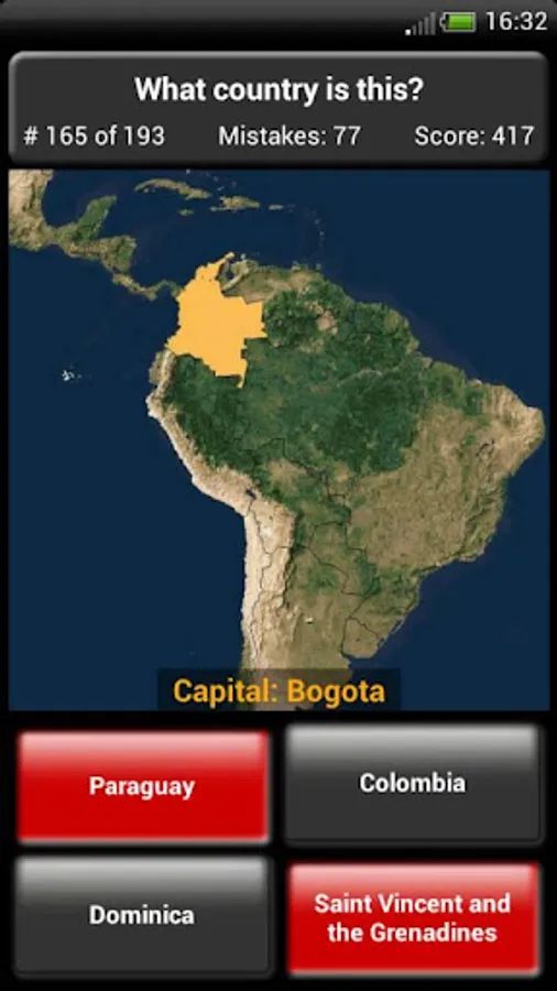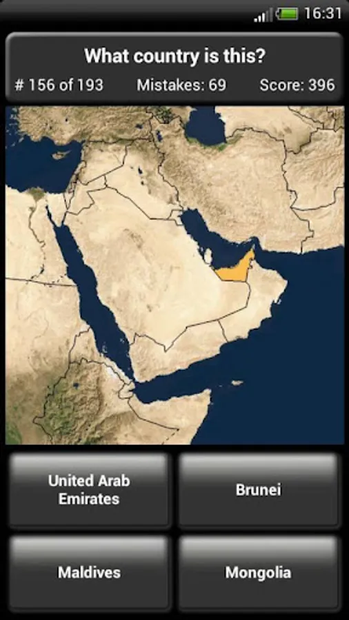 "Country Maps Quiz" invites you to test your knowledge of countries around the world. It may be used for testing and educational purposes for people well-informed about the map of the world. Game consists of 193 illustrated questions containing fragments of geographical map. Each question has 4 possible answers. When you tap one of the answers, the default color of the pressed button is changed to green (when it was the right answer) or to red (wrong answer). You have 3 attempts to give the right answer. If you give it at the first attempt you will receive 3 points, at the second attempt - 2 points, at the third - 1 point. Play the "Country Maps Quiz" quiz now and find out how well you know your world!