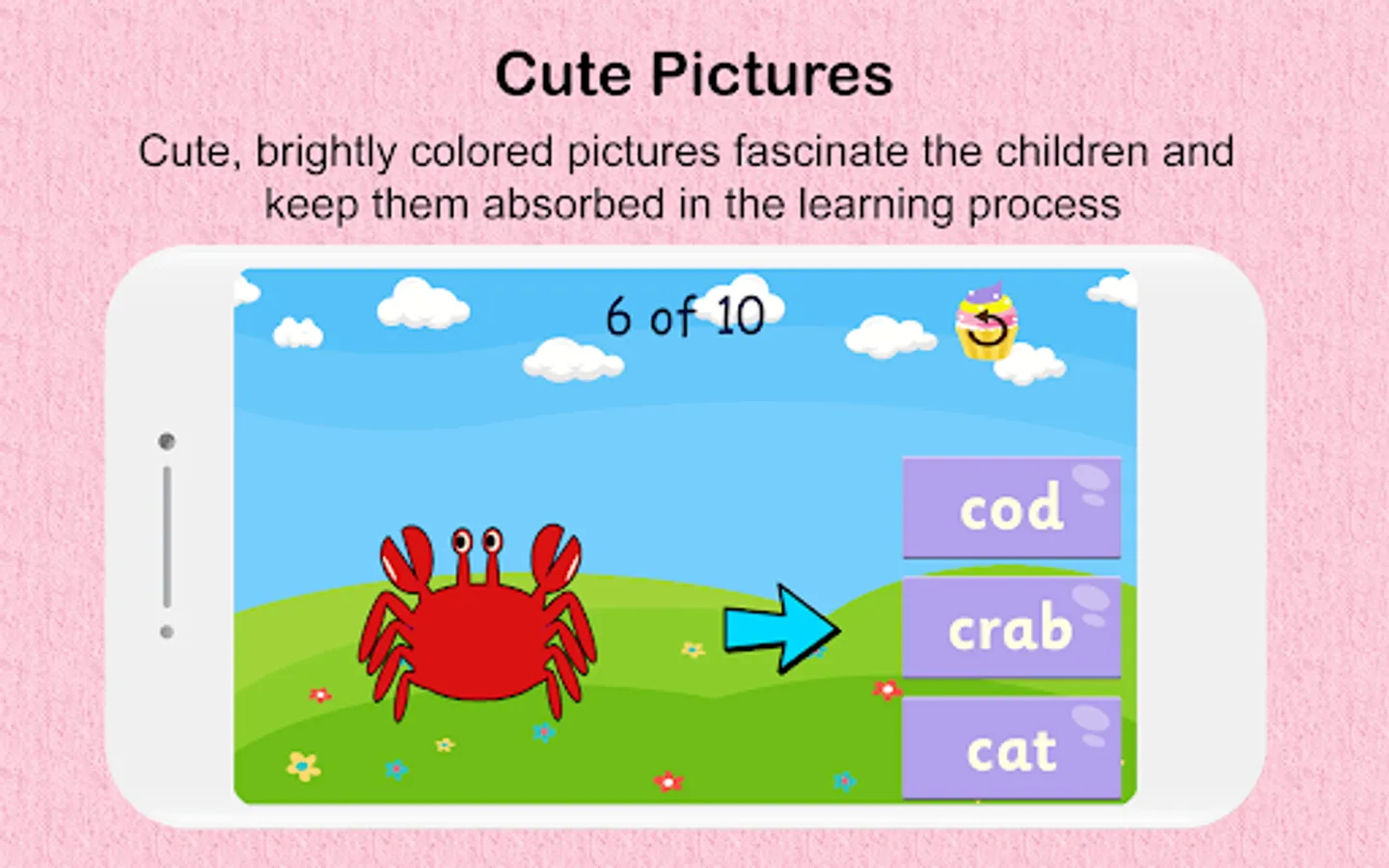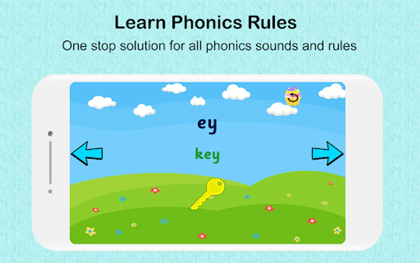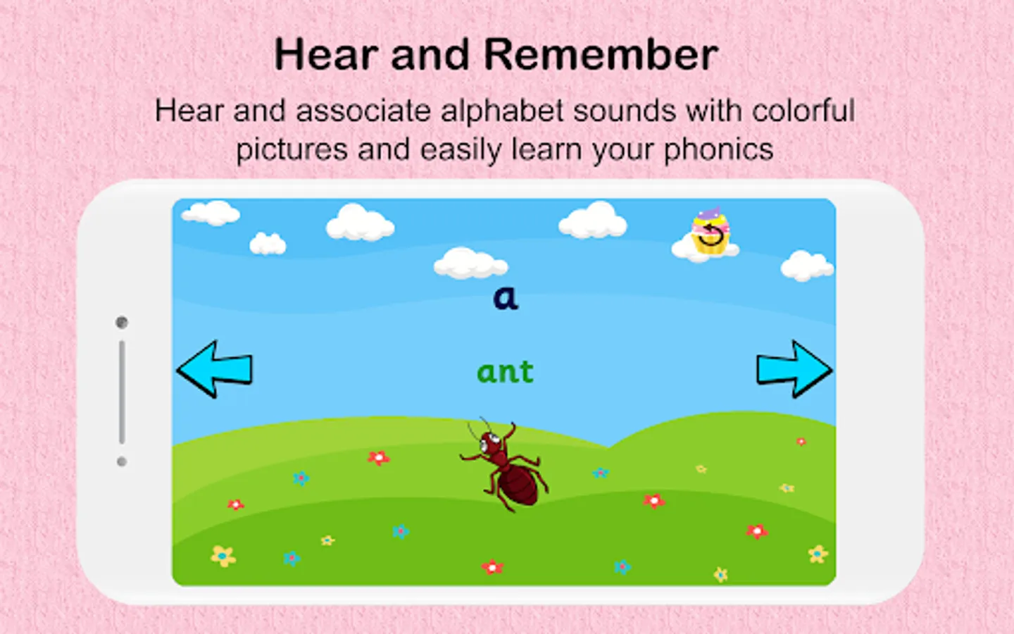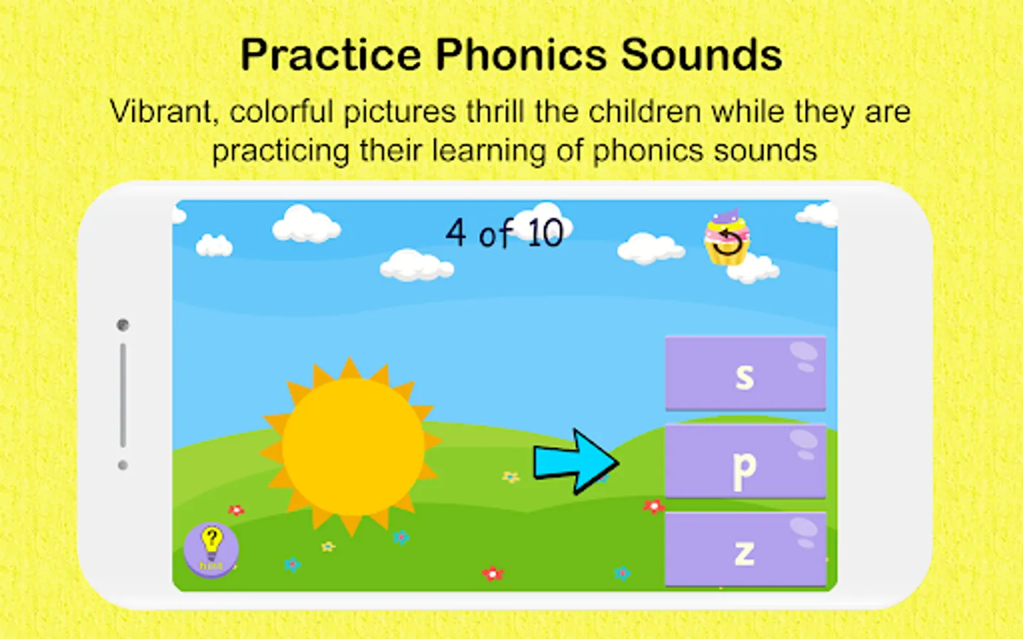 1. Learn the phonic sounds by clicking on the Phonics button. The Phonics Fun for Kids app helps the children learn the easy alphabet sounds first such as a, s, i, t, p, etc. using the jolly phonics order. Colorful pictures along with each English alphabet letter or phonics rule will keep the children involved.
