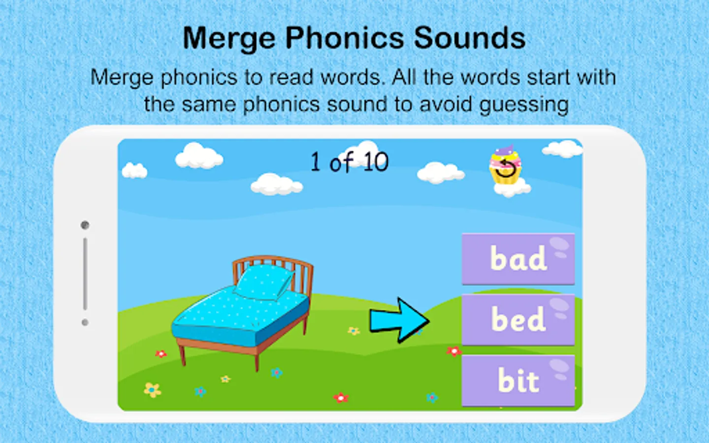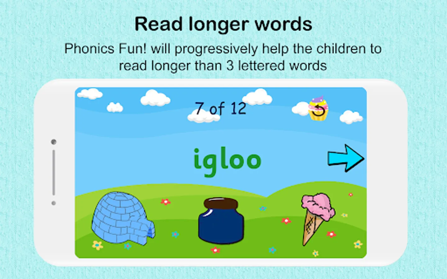 5. The children can continue learning advanced phonic sounds by clicking on the Phonics button. Progress is saved everywhere so that they can start from where they left off. The game will also progress at the same pace as the sounds and in advanced levels, the advanced phonics rules will also be tested. By level 16, your children will be reading long words like "mountain","eraser", "underline", etc.