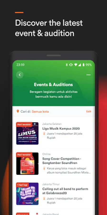 Challenge yourself with Soundfren through exclusive auditions and competitions to amplify your music journey by exposing yourself through stage performance opportunities. No idea where you might end up performing this weekend? Find out here!