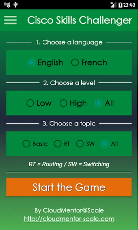You can select the level of difficulty and the topic you want. The topics are Routing (OSPF, EIGPR, RIP, BGP, ISIS etc), Switching (STP, VTP, VLAN etc) and Bascis Concepts (ACL, SSH, etc). You can choose to receive all available topics.