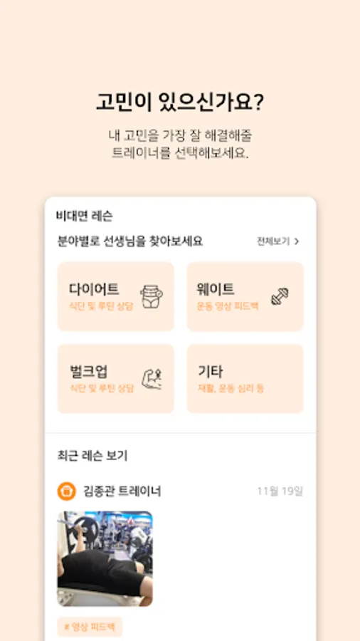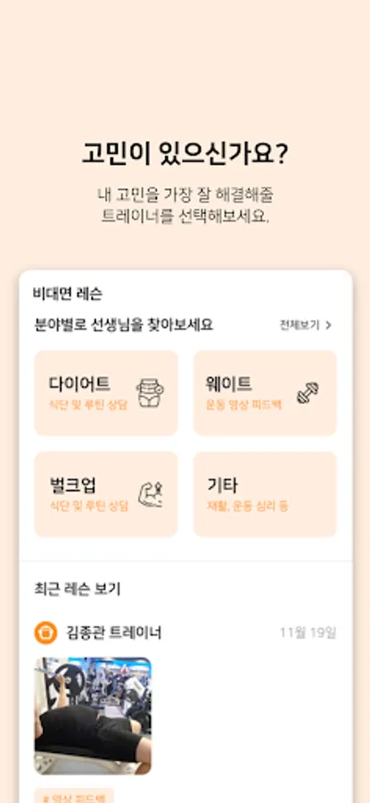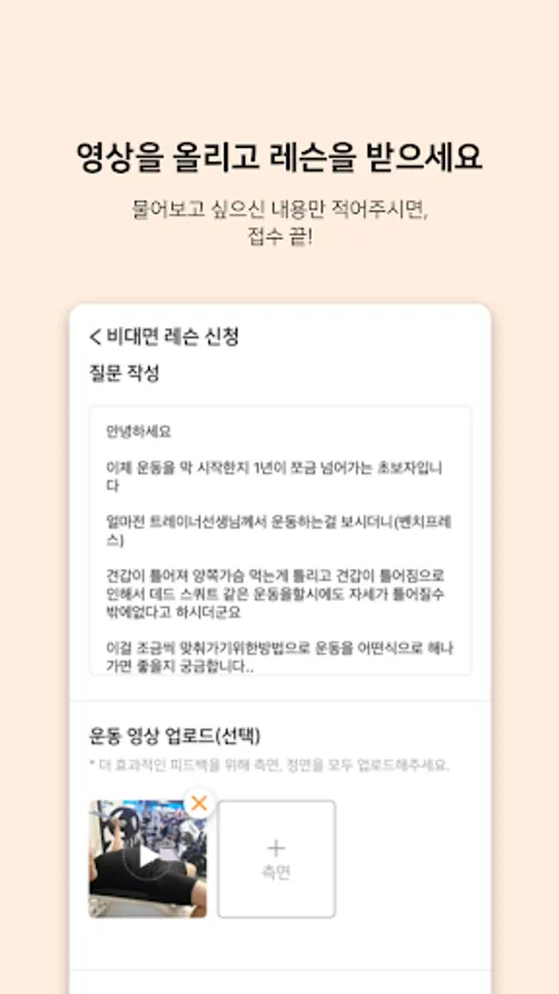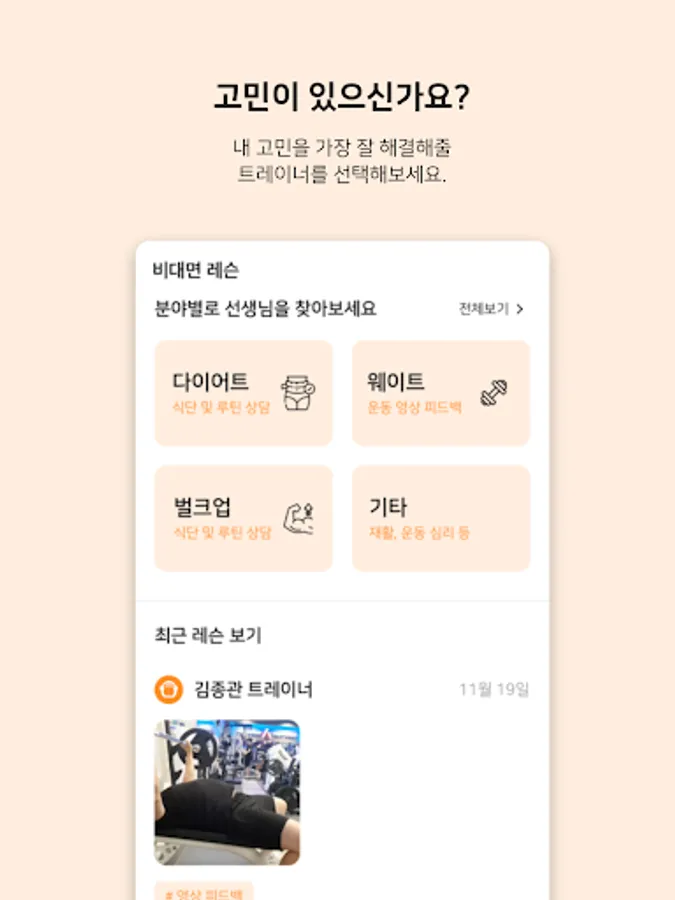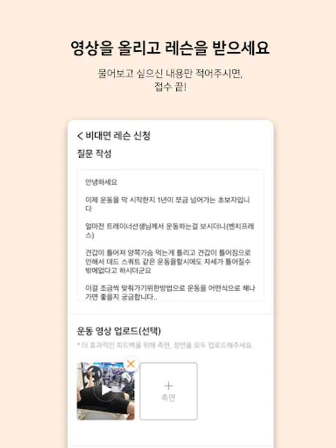 - Upload an exercise video and take lessons non-face-to-face. You can choose your own professional trainer in each field.
