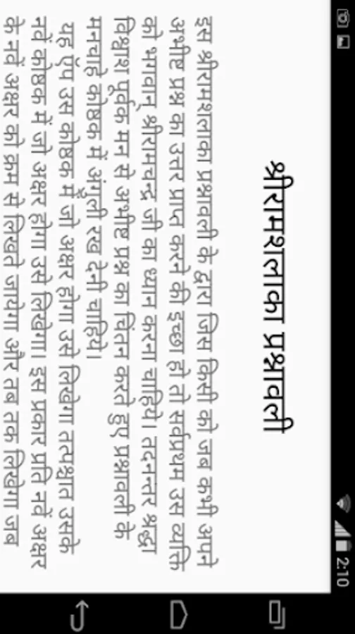 This app will write the letter which will be in that parenthesis, after that it will write the letter which will be in its ninth parenthesis. In this way the ninth letter of every ninth letter will be written in sequence and will be written till it reaches the first parenthesis. All these letters will complete a quadruple (chaupai) of Shree Ramcharitmanas. The answer to the desired question of the questioner will be contained in the meaning of that quadruple only.