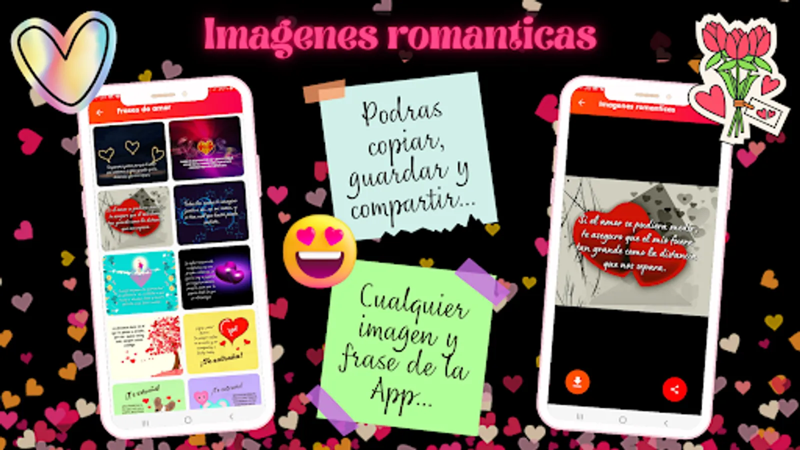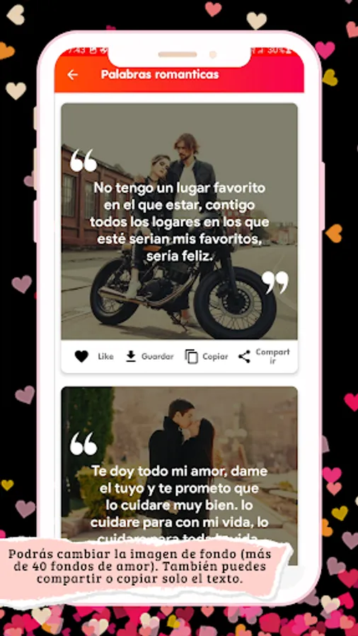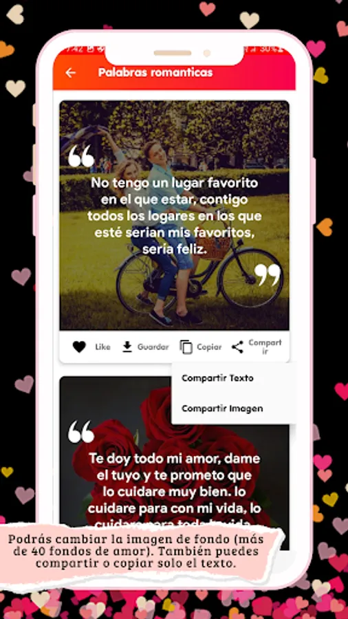 Don't waste any more time and download the application. Here you will find the best romantic images to dedicate to the girl or boy of your dreams. You just have to dedicate beautiful images of love with phrases and it will fall at your feet. And that feeling of love will be bigger every day, if you send some romantic images of love to the boy or girl you like. Send your partner these beautiful images of love, love poems, love postcards, which will be of great help to create an unbreakable bond between you and your partner. If you send your boyfriend love poems with images of love and love postcards full of tenderness and passion every day, he will be happy by your side, and he will never want to be separated from you again. Show the great love you feel for your girlfriend dedicating images with love phrases; Or you can send some messages to fall in love with images of love so that she feels loved. With this application it will be easier to always keep in love with that person who steals your heart and makes you sigh. Never stop being a retailer, always send beautiful images of love with beautiful images, 7 days a week, 365 days a year. Everyone will die of envy to know that you send love verses with beautiful images to your boyfriend. And don't forget: the application is designed to share romantic images of love with your partner, through any social network (Twitter, Facebook, WhatsApp, Telegram) that you have installed on your phone. The App romantic images of love will be your best ally from now on and forever. So download the best application and get the best images of love and fall in love with whoever you want. Be careful: the details say more than a thousand words, so dedicate romantic images to your boyfriend or girlfriend, they will thank you with a kiss. ππ«β€οΈ