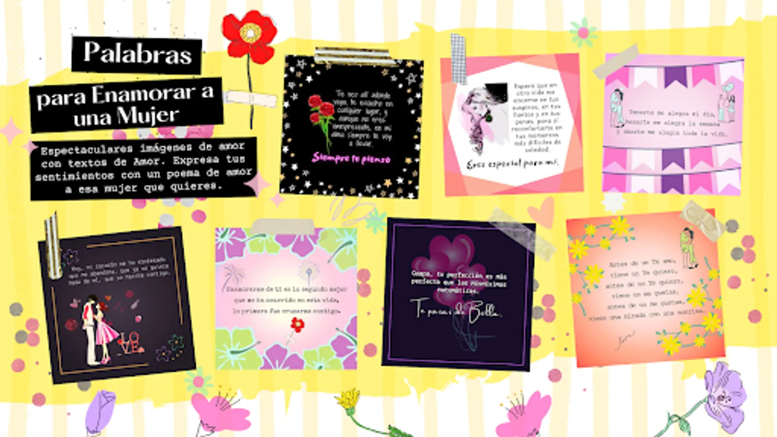 Do not hesitate to download this App if you want to give a nice surprise with phrases to fall in love with images. The application that is totally Free. In it you will find images to conquer it will help you show your feelings through love poems for a woman. It has never been so easy to send love messages for a woman. This App will be your best ally. π±π π« ππ±