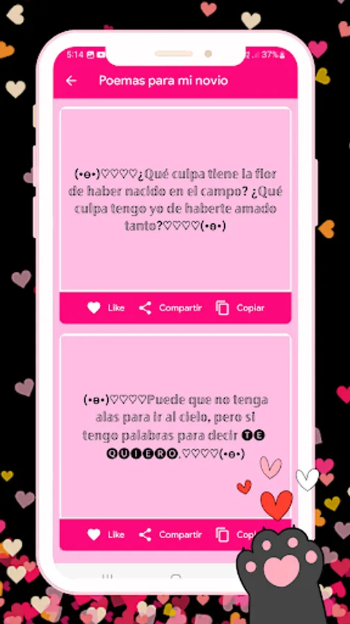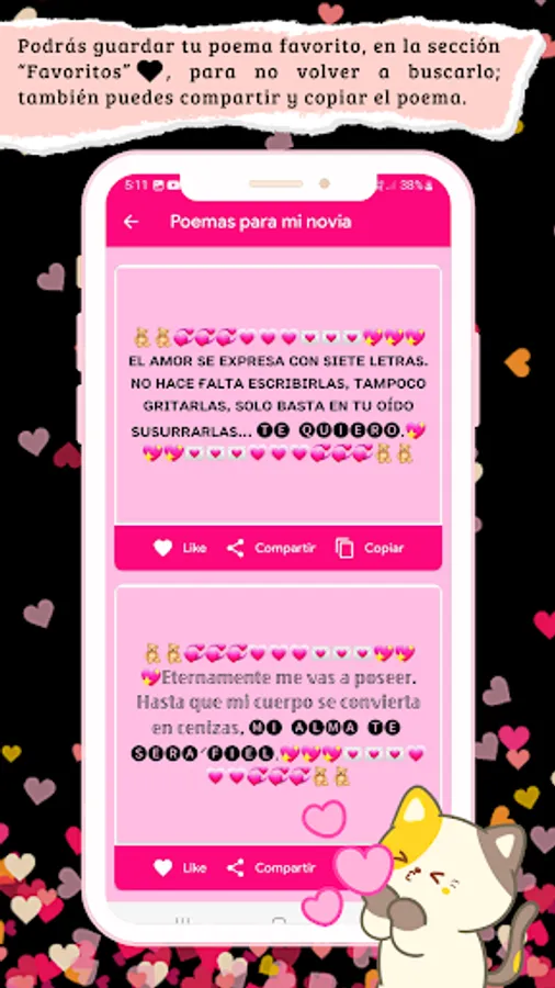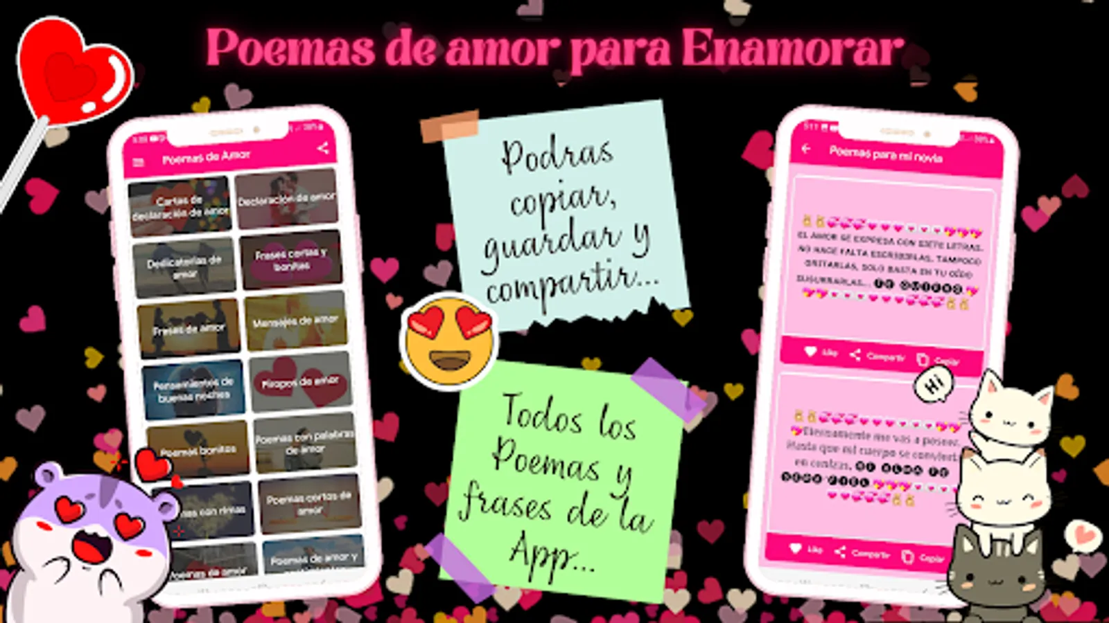 Do you want to surprise by sending beautiful love poems to that special person who steals your heart? Well, look no further ... ππ Love poems to fall in love is an App specially designed to dedicate the best love poems for a woman or a man. We have the best beautiful poems in the entire Play Store. You will also find spectacular love poems to make a woman fall in love, love poems for my girlfriend, poems for whatsapp and poems for my wife. You will be able to copy, share (to any social network without restriction) and save your best love poems within the App so that you do not look for it again; so you can use it at the exact moment. And all with just one click. πππ±