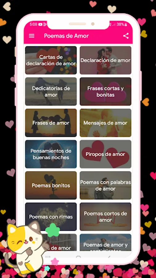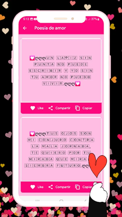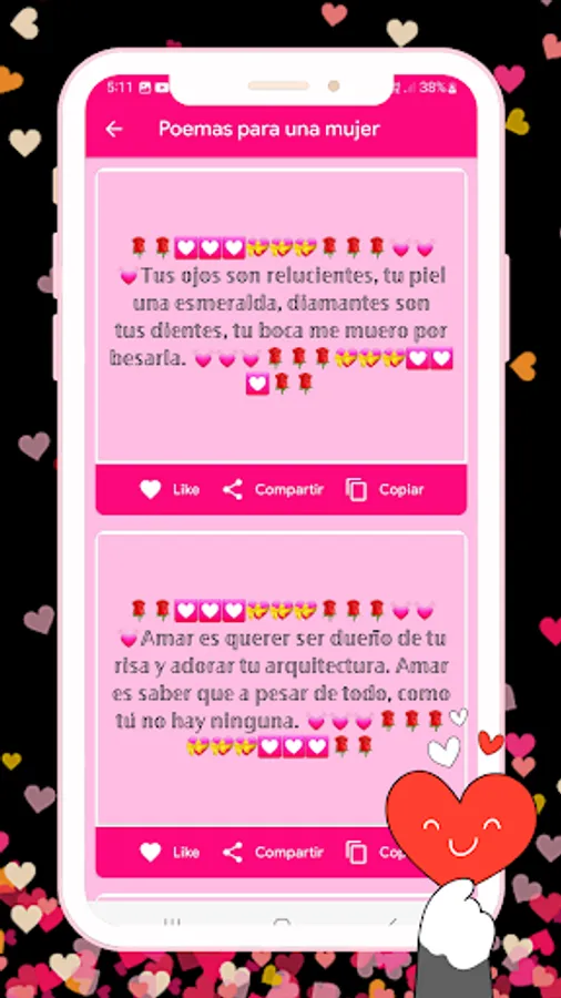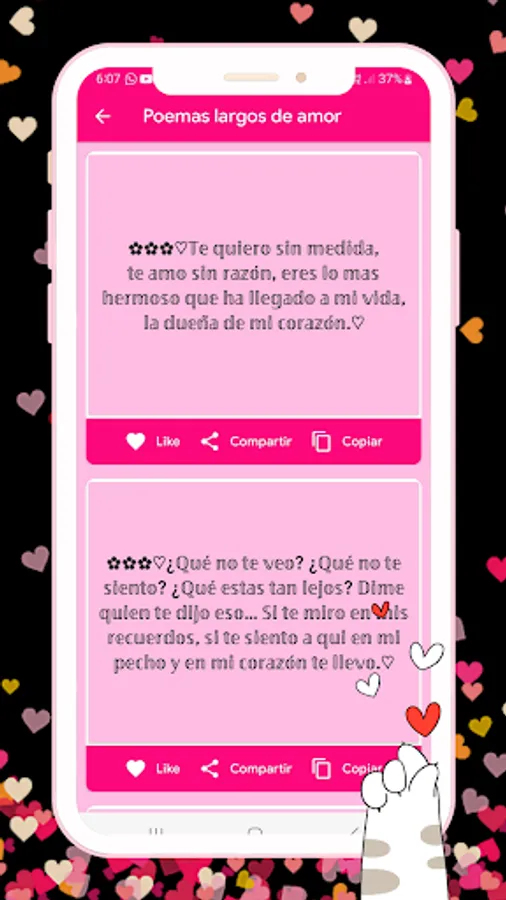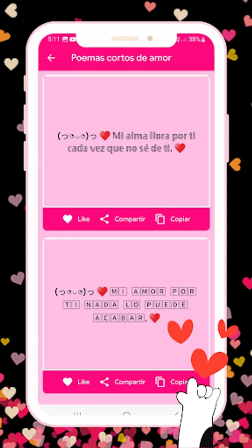 Not all of us have the great virtue of creating poems and dedicating them to that special person who has us in love. Transmitting what we feel is almost impossible ... Until now, because that is over: with the love poems to fall in love app you can send the best poems for a beautiful woman, and if you are looking for poems to seduce a woman, you will also find it here. Have no doubt that here you will find all the poems to conquer that you want. For this reason, I leave in your hands the best application of poems to fall in love with which you can send beautiful poems to make a woman fall in love and poems with love rhymes. Come onβ¦! Don't let the girl or boy of your dreams get out of your hands. Fall in love like the greats. π±β€οΈπ«β€οΈπ±