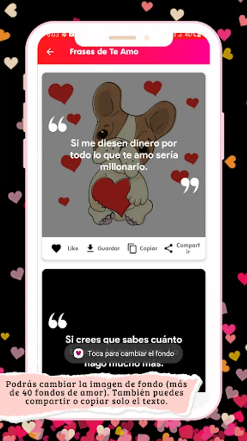β Are you afraid to express your feelings, you don't know how to do it? This application of images of I love you my Love will help you to conquer that special person that occupies your heart day by day. Think no more and download the app, inside you will find the best love phrases with images to dedicate to your partner. You will also find beautiful love poems with images, love verses with images, love compliments with images and love texts to fall in love with. I give you my word that you will not be disappointed. πππ