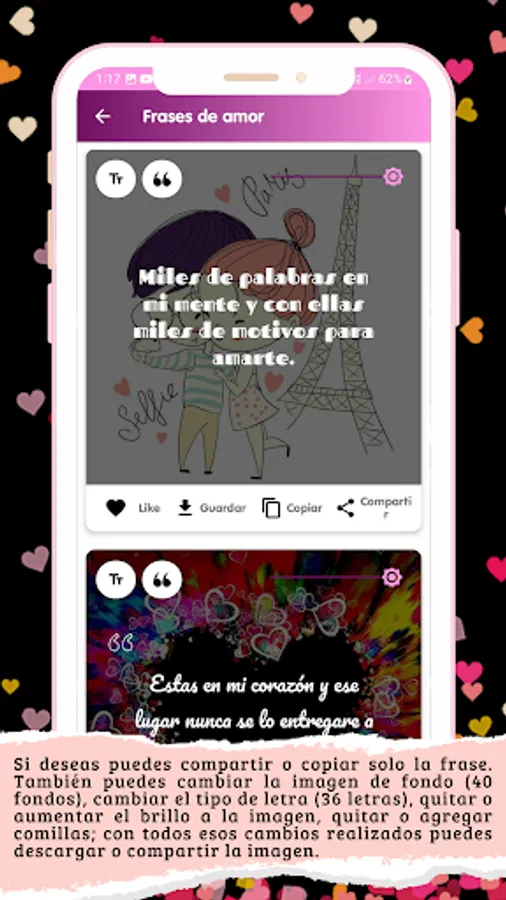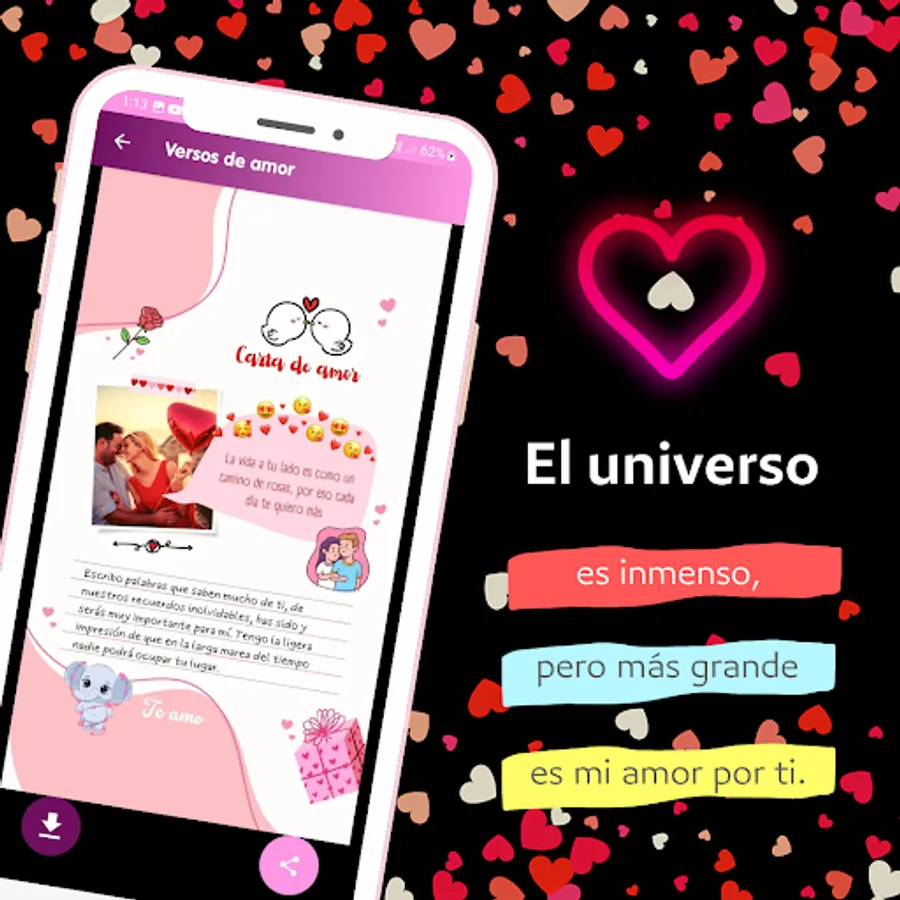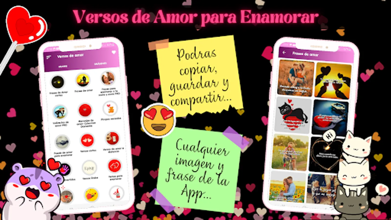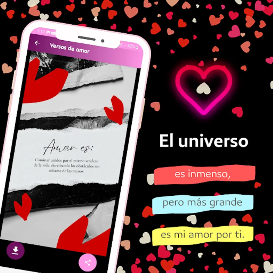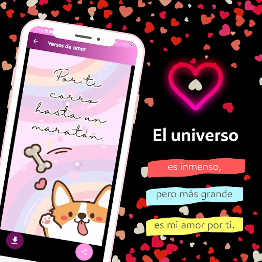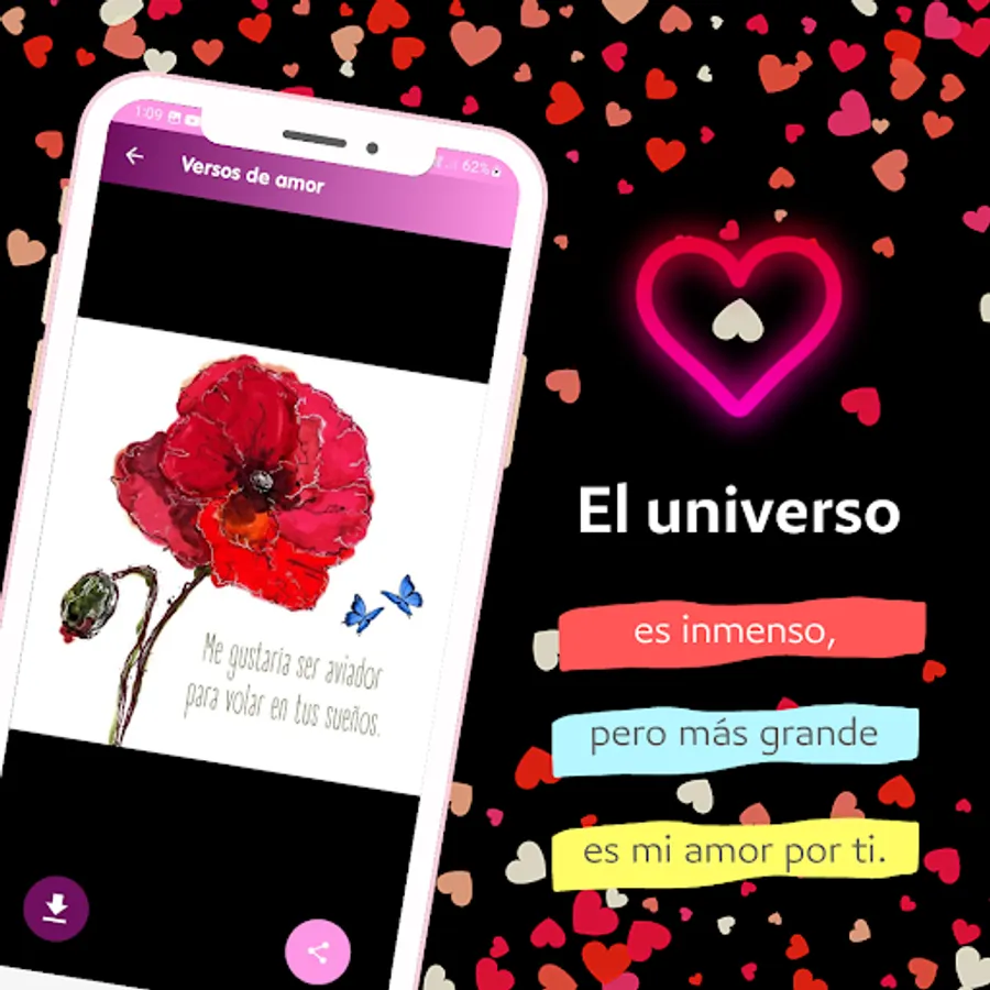 Do you need to send cute love verses to that special person who steals your heart? Well here you have it all ... ππ Love verses to fall in love is an App specially designed to dedicate the best free love verses to a woman or a man. We have the best verses to dedicate from the entire Play Store. You can also find spectacular verses to fall in love with, love poems, love verses for my girlfriend, verses for my wife and love messages that you can dedicate to your partner or the person you like. You will be able to copy, share (to any social network without restriction) and save your best love verses within the App so that you do not look for it again; so you can use it at the exact moment. And all with just one click. πππ±