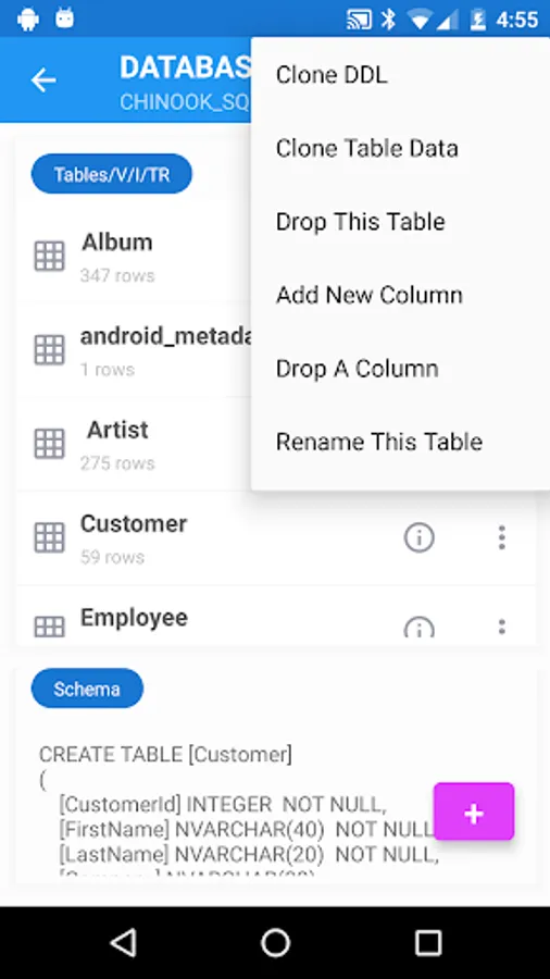 [✔] In table list page, long press has many options such as clone schema, clone data, drop/rename table etc.