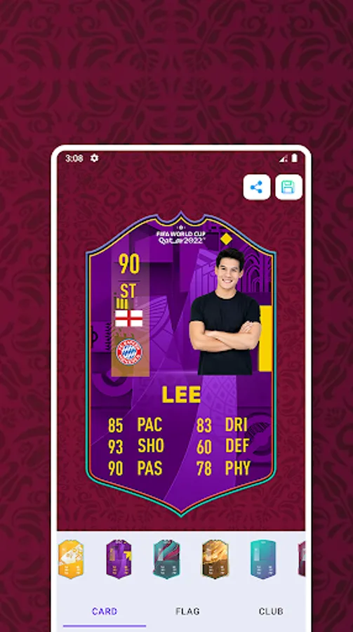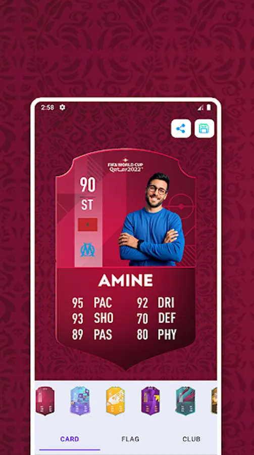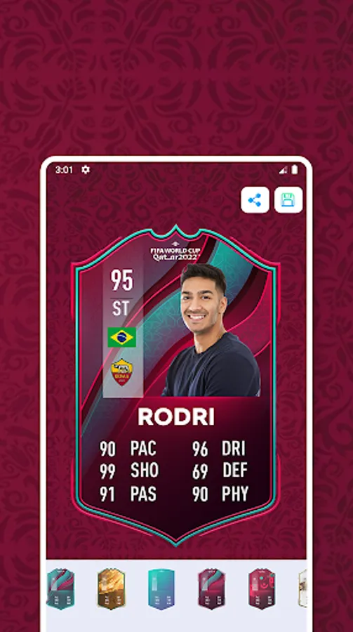 Create your own personalized card with all original World Cup card backgrounds and styles, add your own image, name, data and share it with your friends on social media! Make your own ultimate team for World Cup !