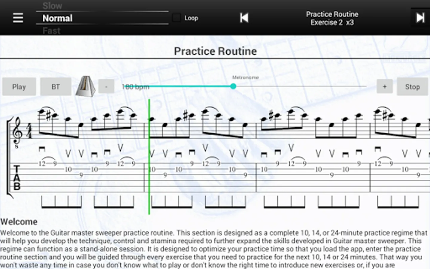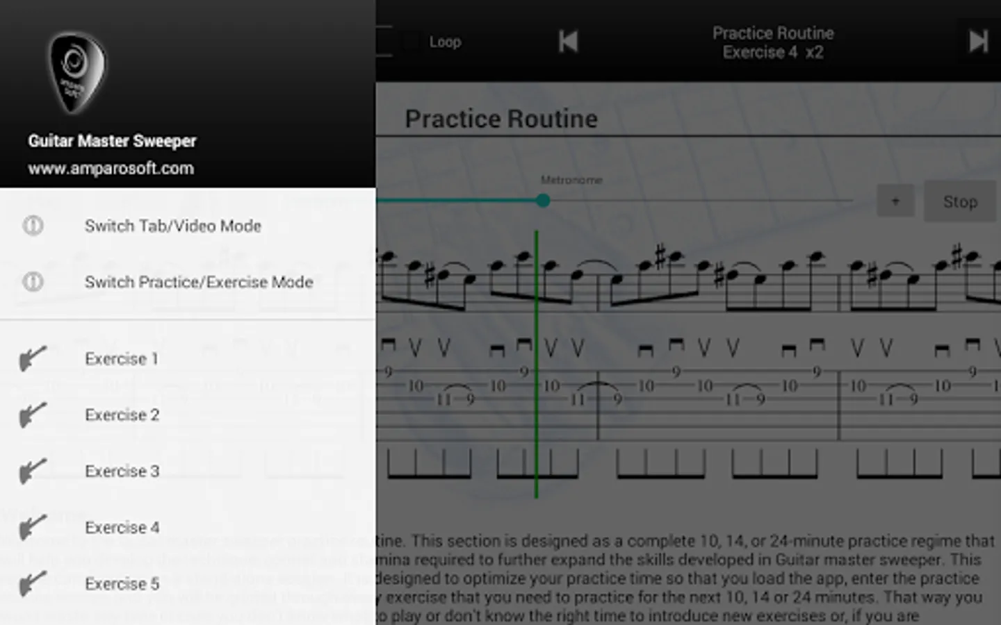 • Complete progressive guitar practice routine composed of 20 exercises for learning the sweep picking technique. Lite version is restricted to 7 exercises without the practice routine.