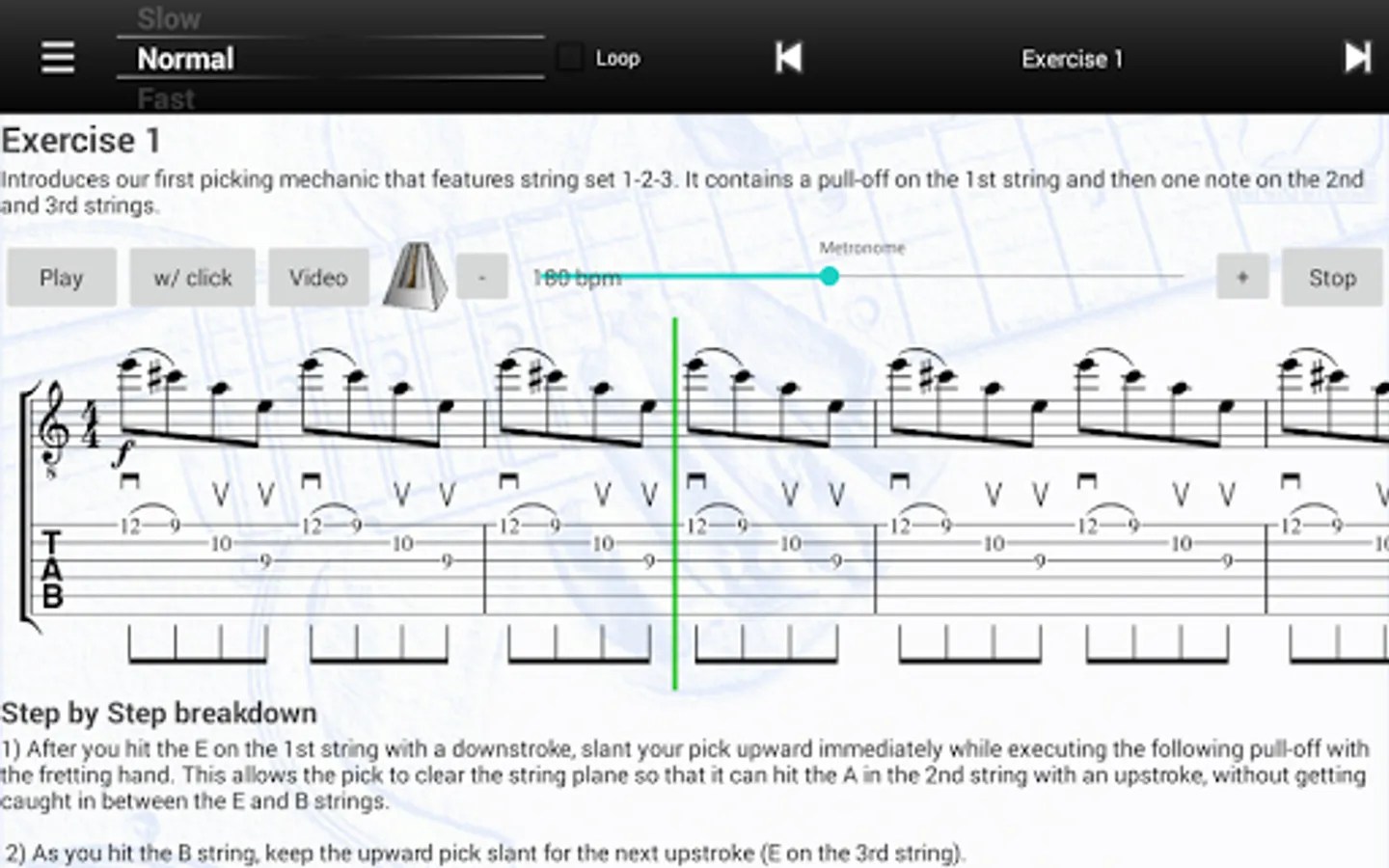 • 60 Videos with right hand, left hand, tabs and animations of the picking motions. Lite version is restricted to 4 videos.