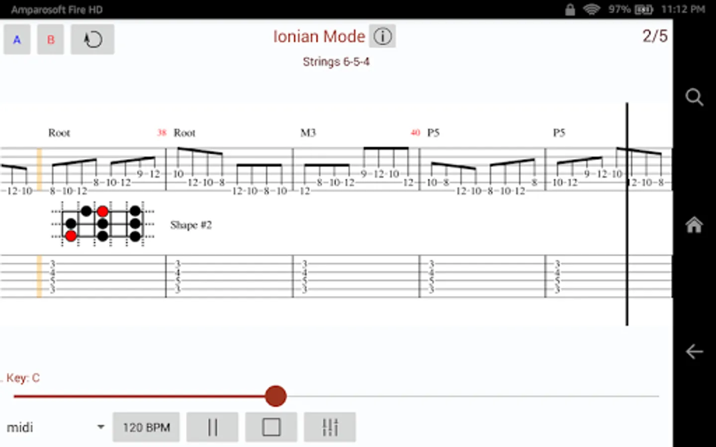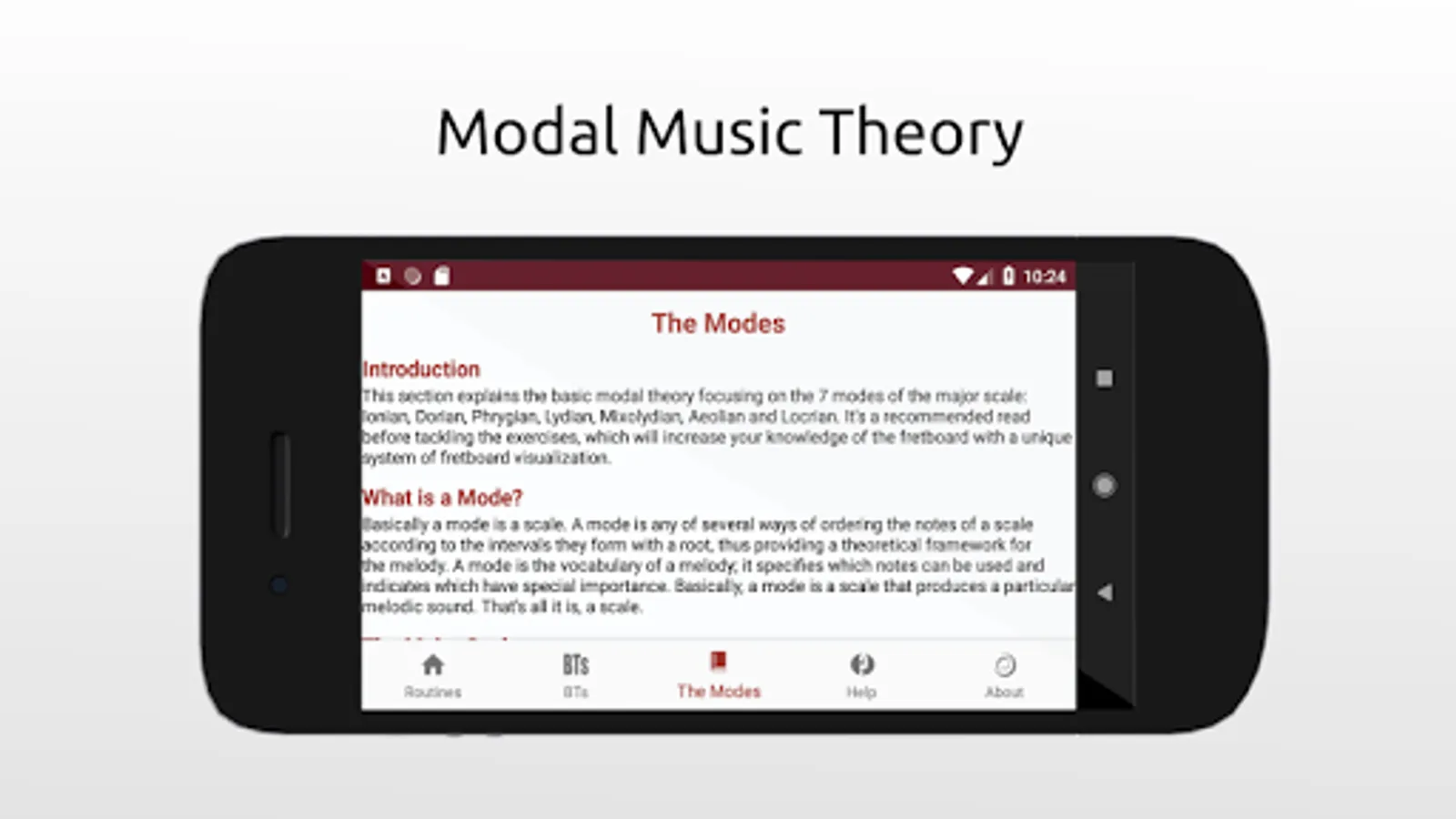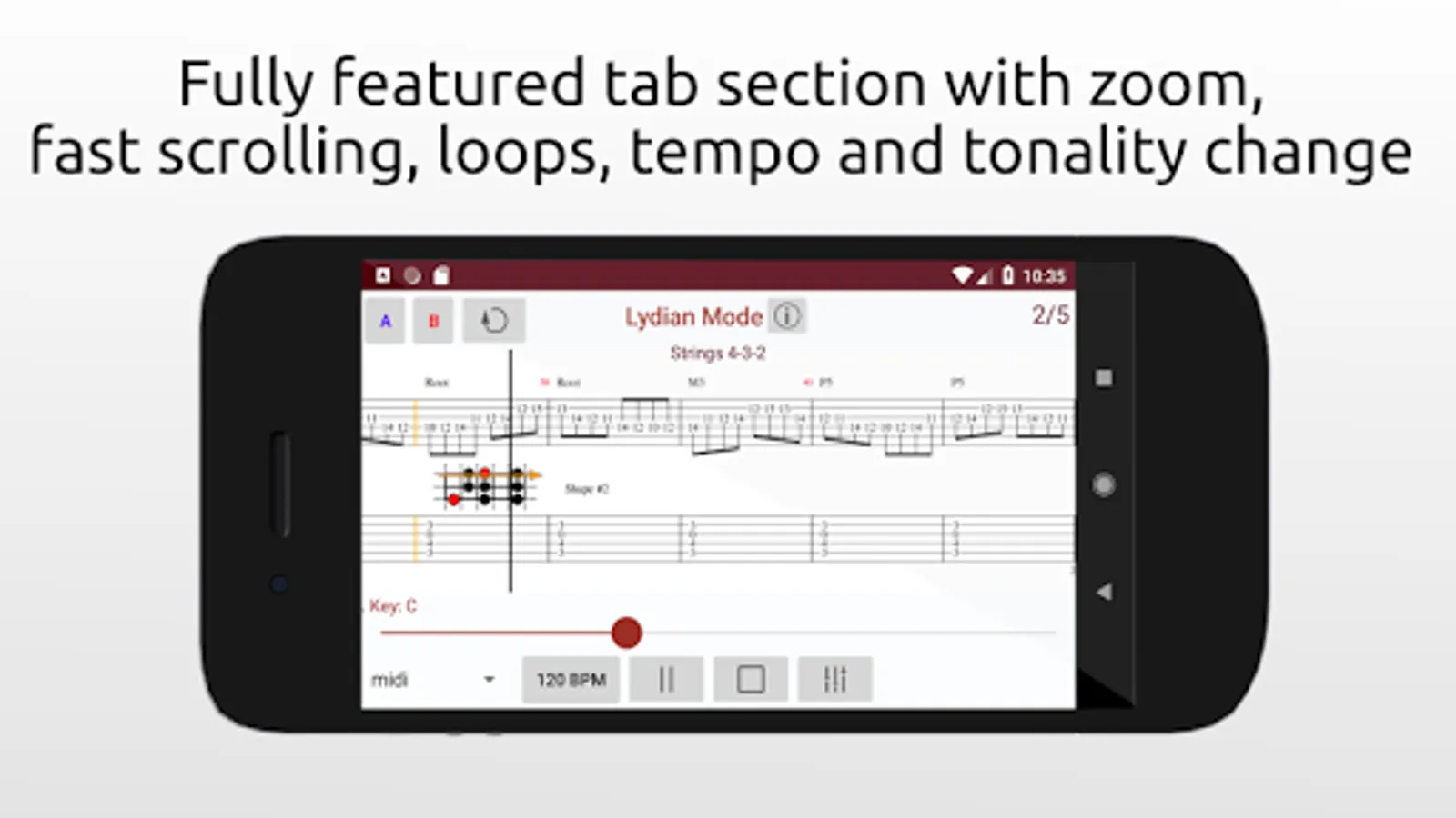 - Fully featured tab section with zoom, fast scrolling, loops, tempo and tonality change - Modal Music Theory